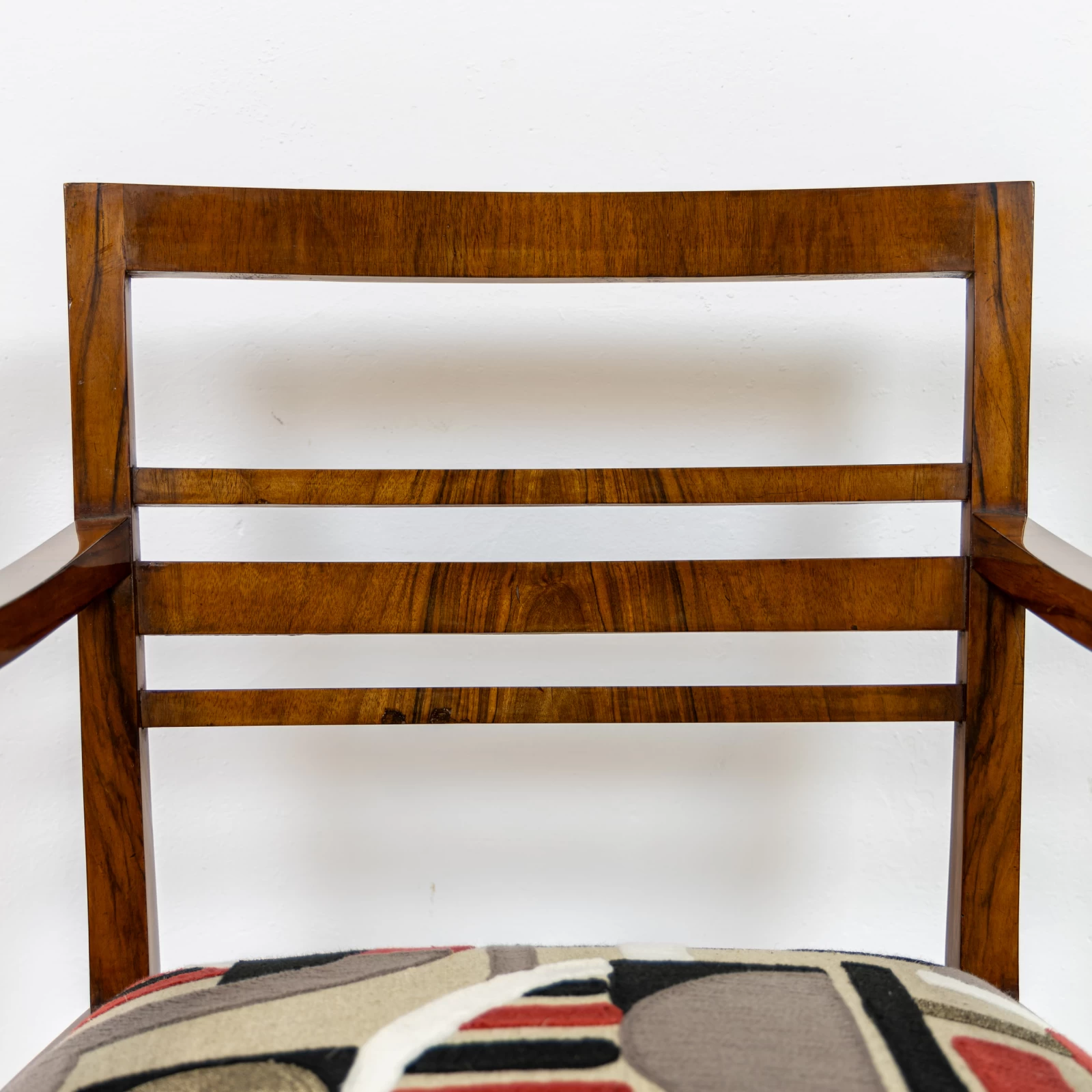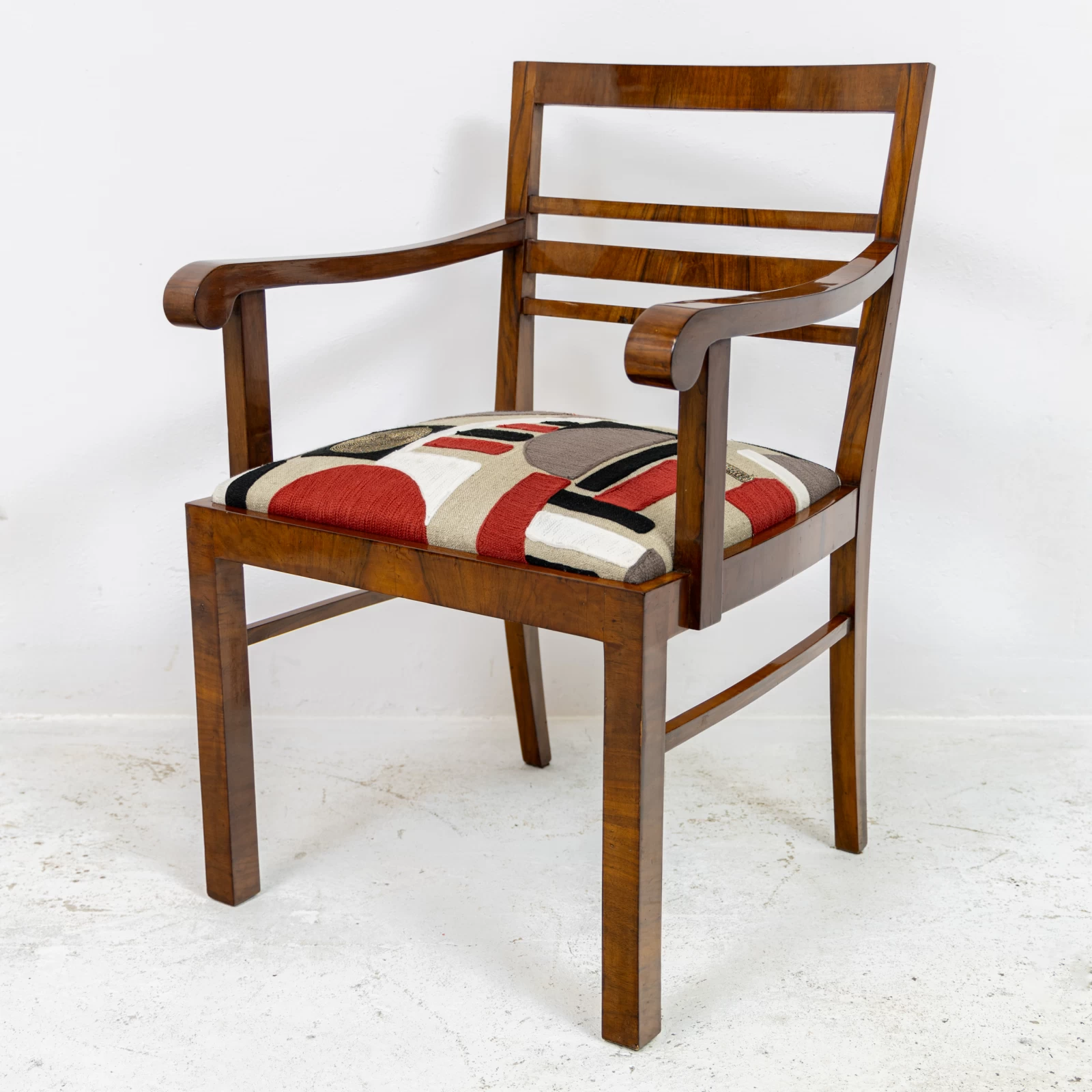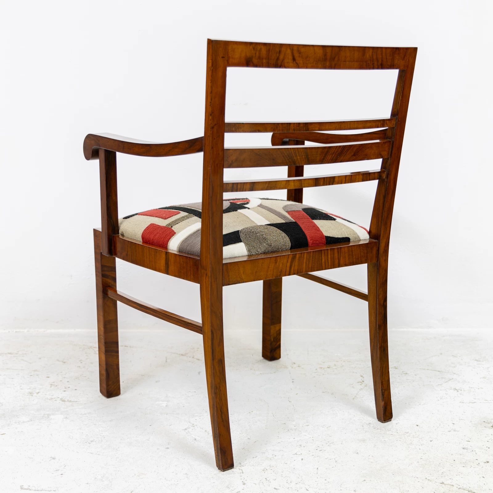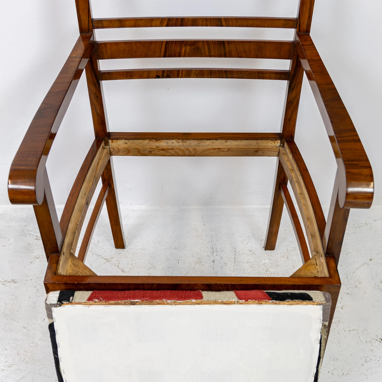 Fotel fornirowany orzechem na konstrukcji z drzewa liściastego. Przeszedł zachowawcze prace konserwatorskie, polegające na odświeżeniu powierzchni szelakiem na bazie politury. Uzyskano dzięki temu gładką powierzchnię na wysoki połysk. Okleina posiada ślady użytkowania i widać na niej rysy, obicia i odbarwienia.