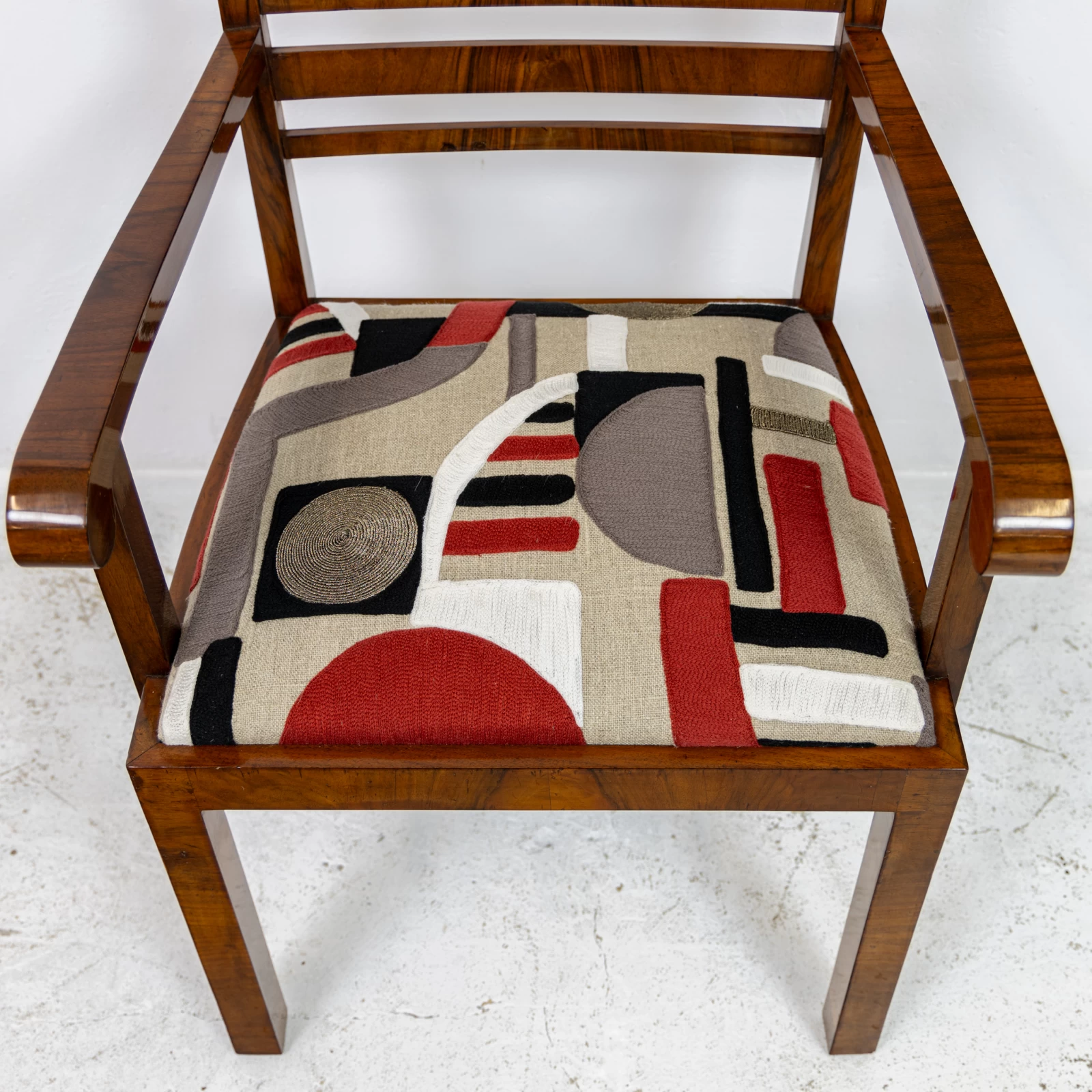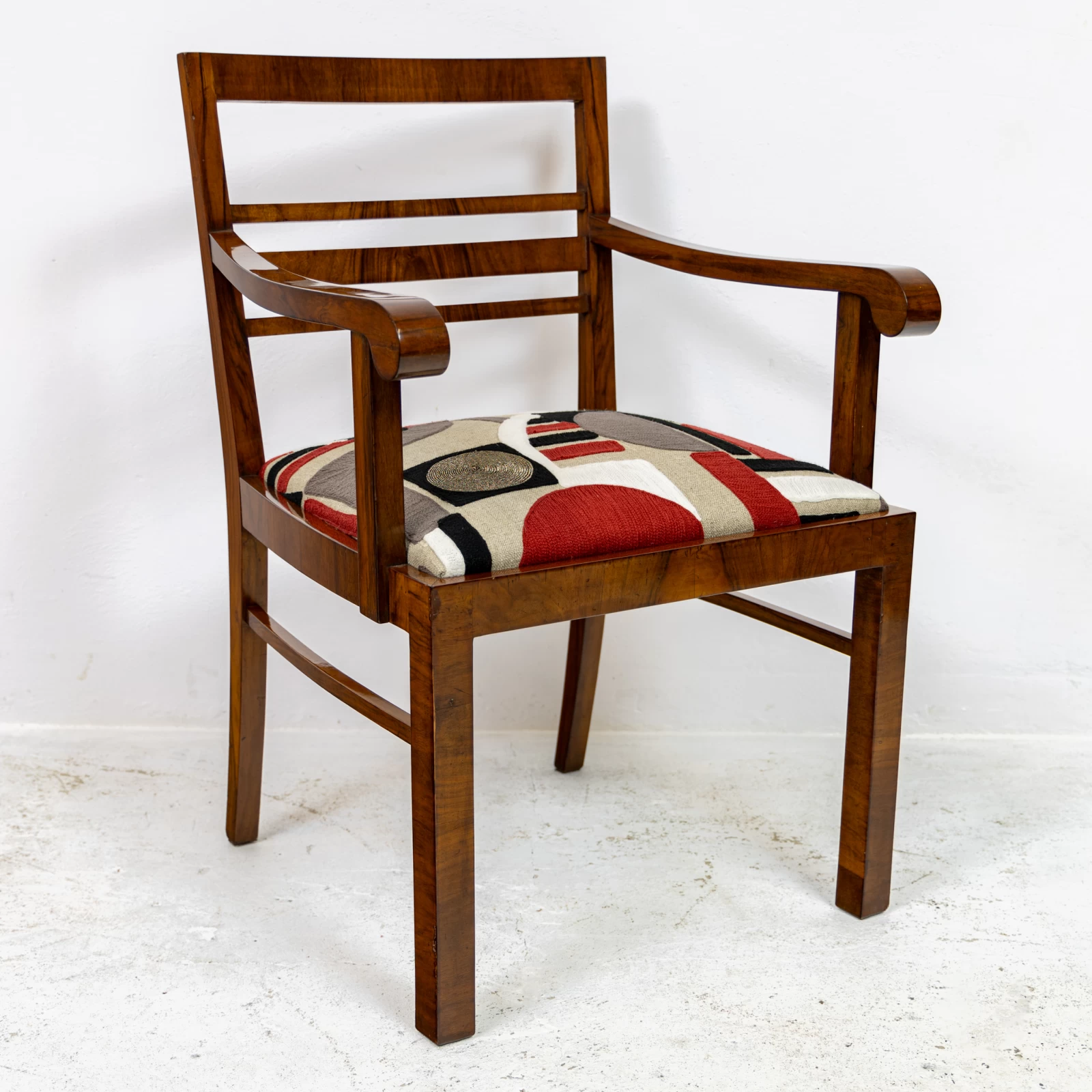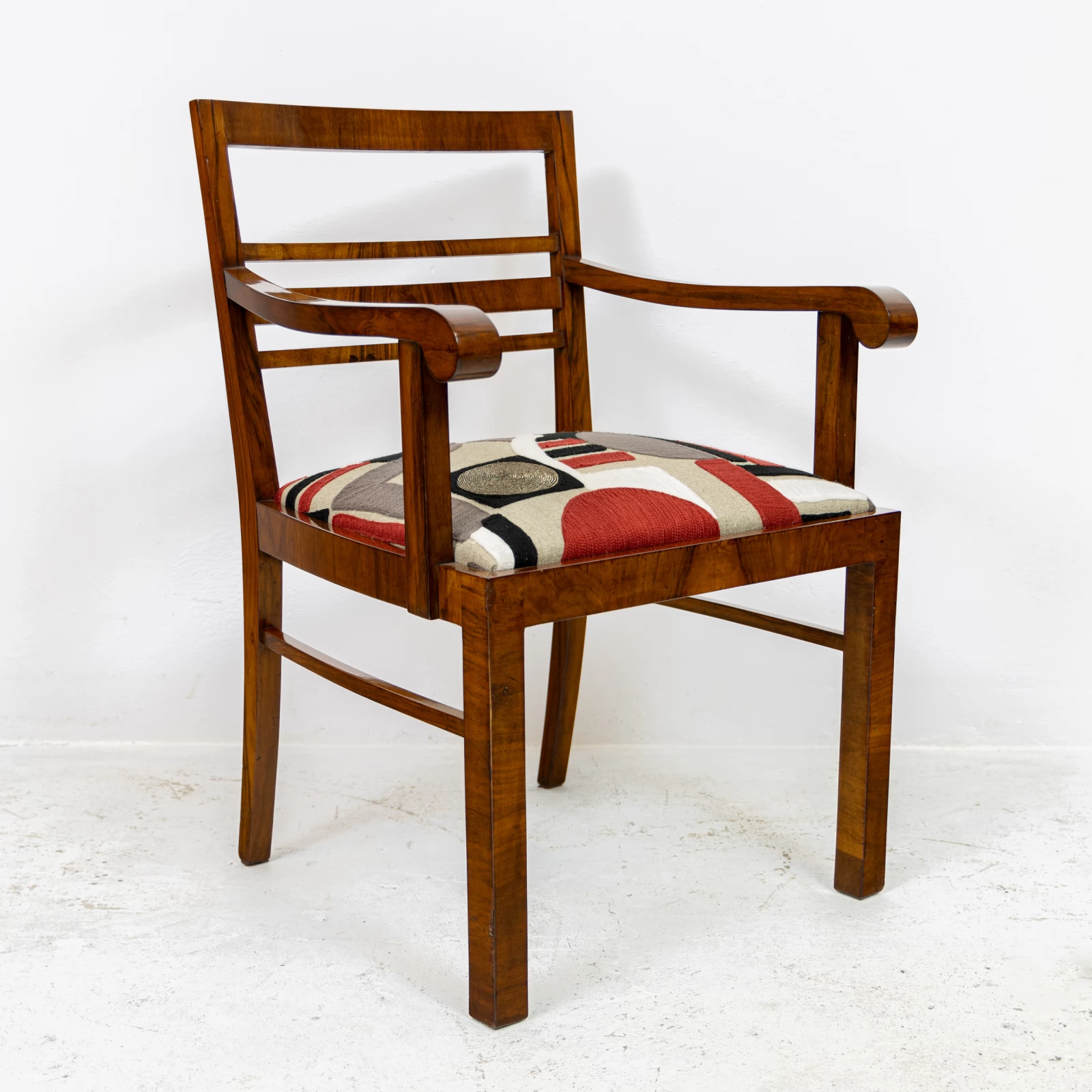 Fotel fornirowany orzechem na konstrukcji z drzewa liściastego. Przeszedł zachowawcze prace konserwatorskie, polegające na odświeżeniu powierzchni szelakiem na bazie politury. Uzyskano dzięki temu gładką powierzchnię na wysoki połysk. Okleina posiada ślady użytkowania i widać na niej rysy, obicia i odbarwienia.