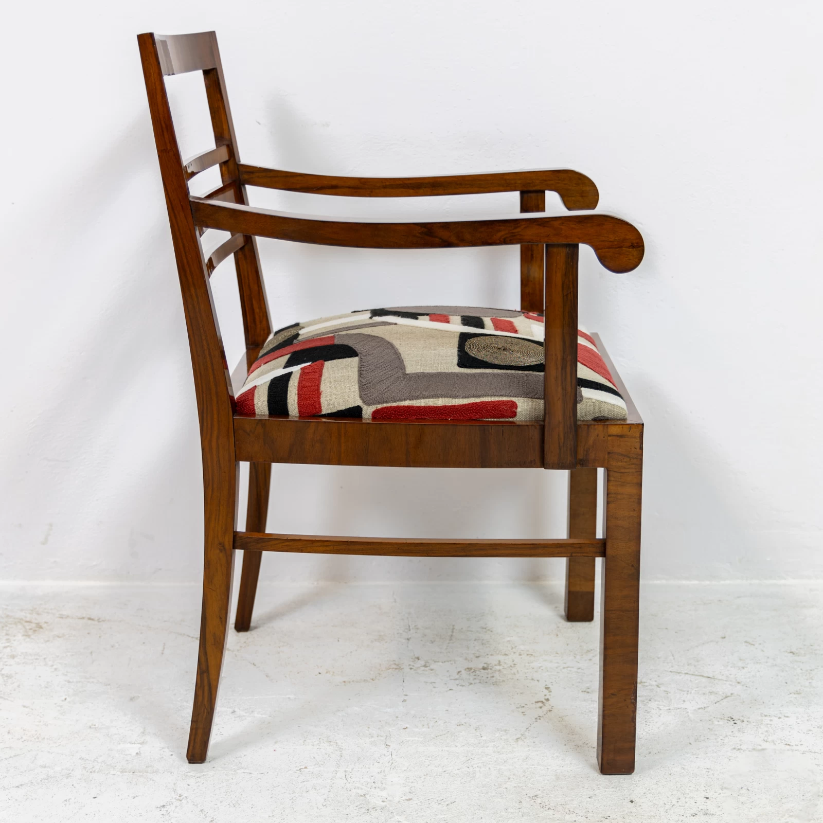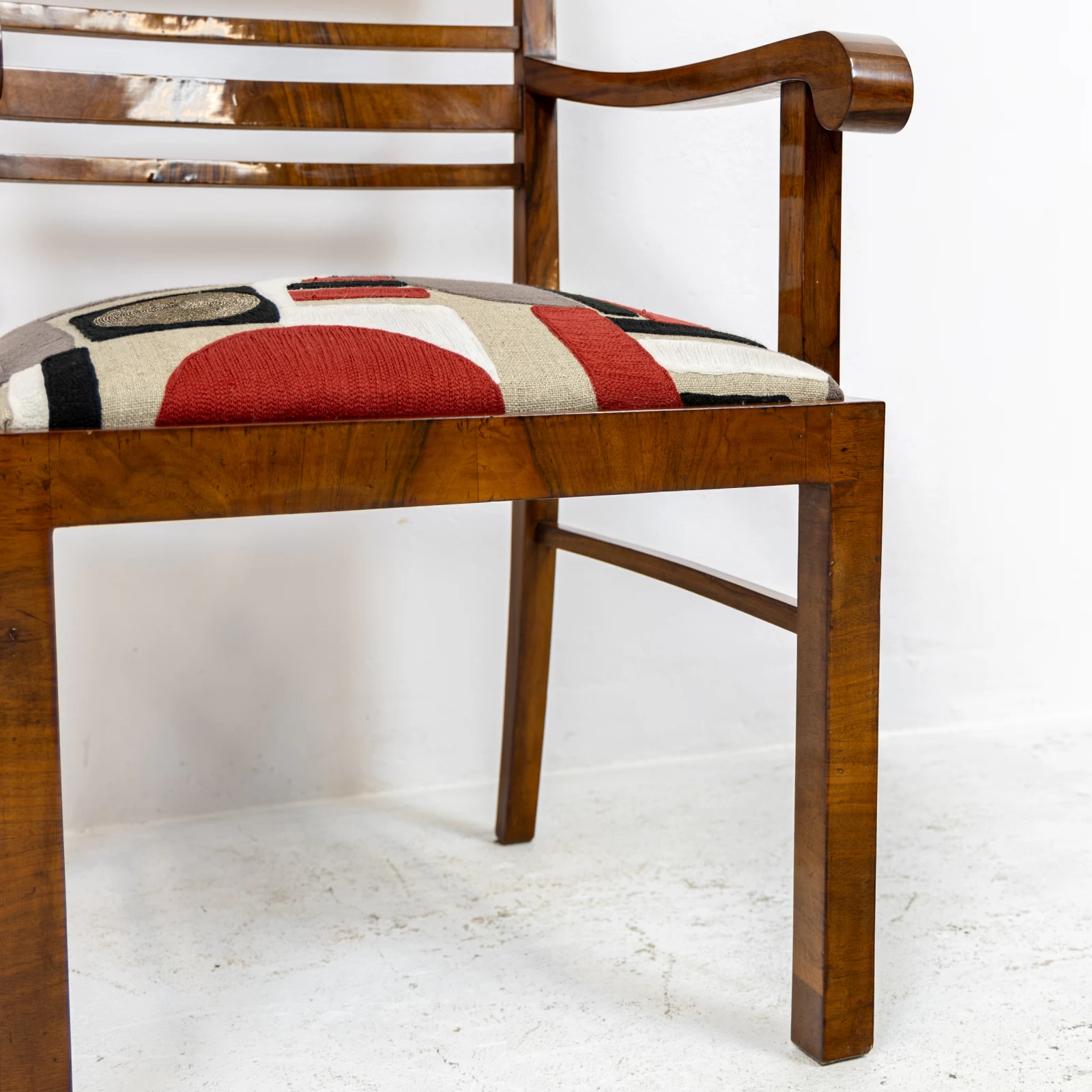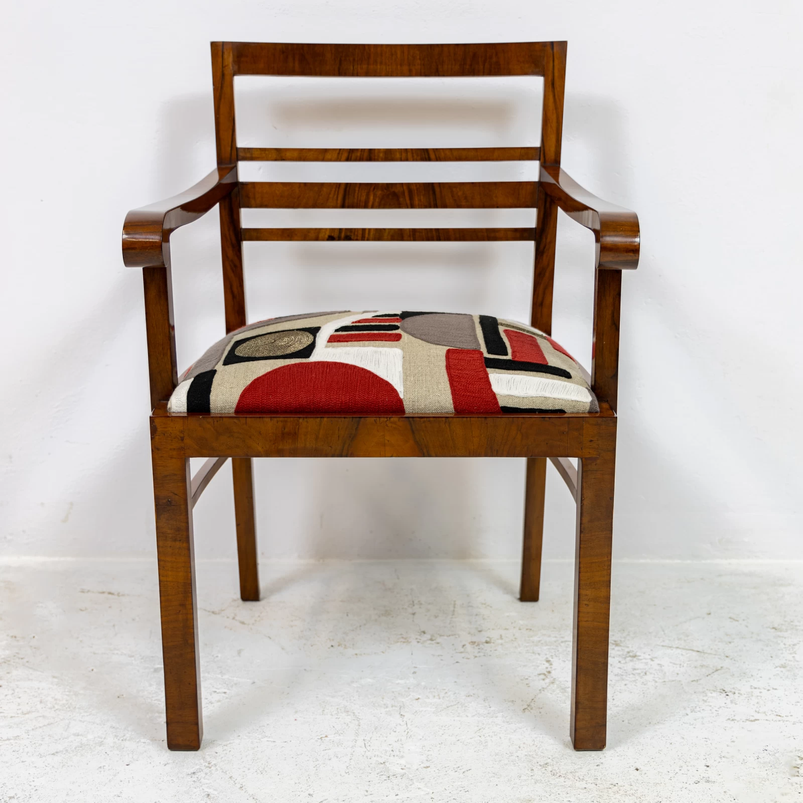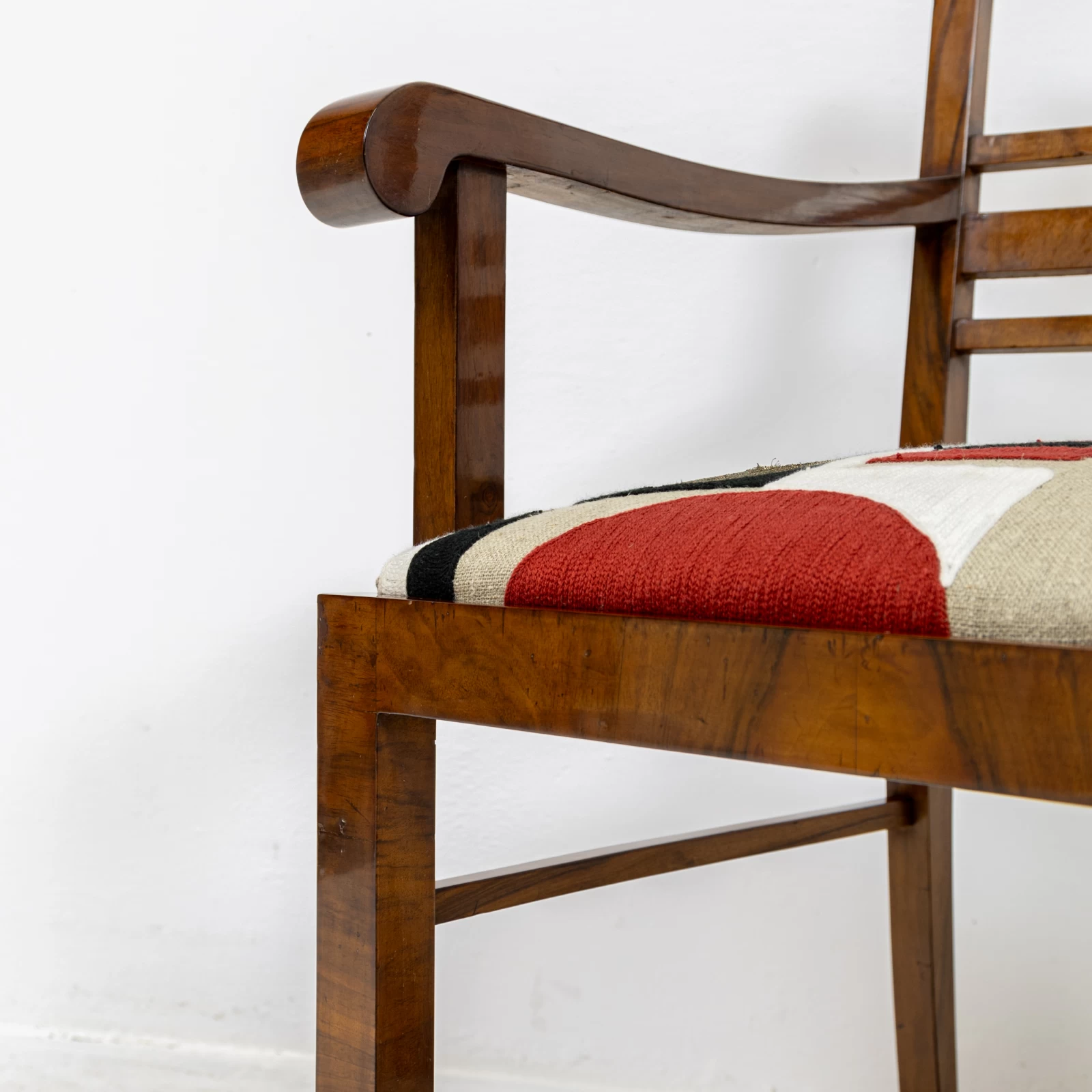 Fotel fornirowany orzechem na konstrukcji z drzewa liściastego. Przeszedł zachowawcze prace konserwatorskie, polegające na odświeżeniu powierzchni szelakiem na bazie politury. Uzyskano dzięki temu gładką powierzchnię na wysoki połysk. Okleina posiada ślady użytkowania i widać na niej rysy, obicia i odbarwienia.