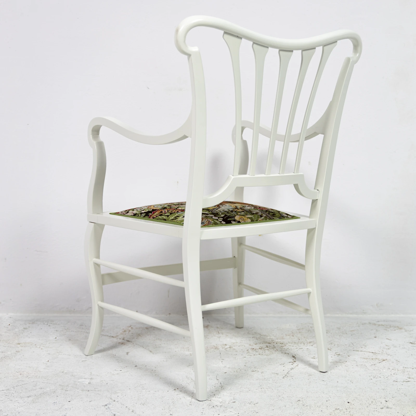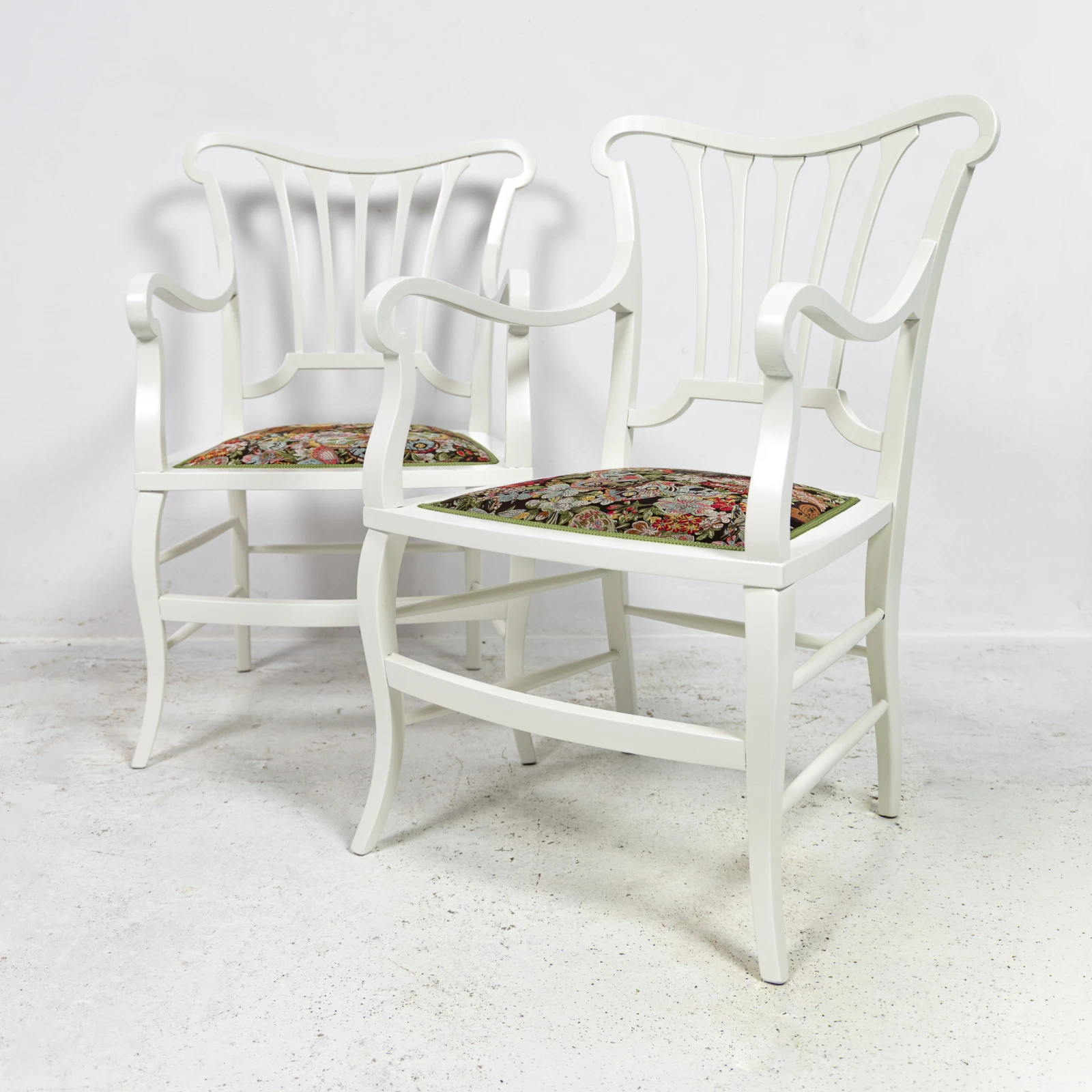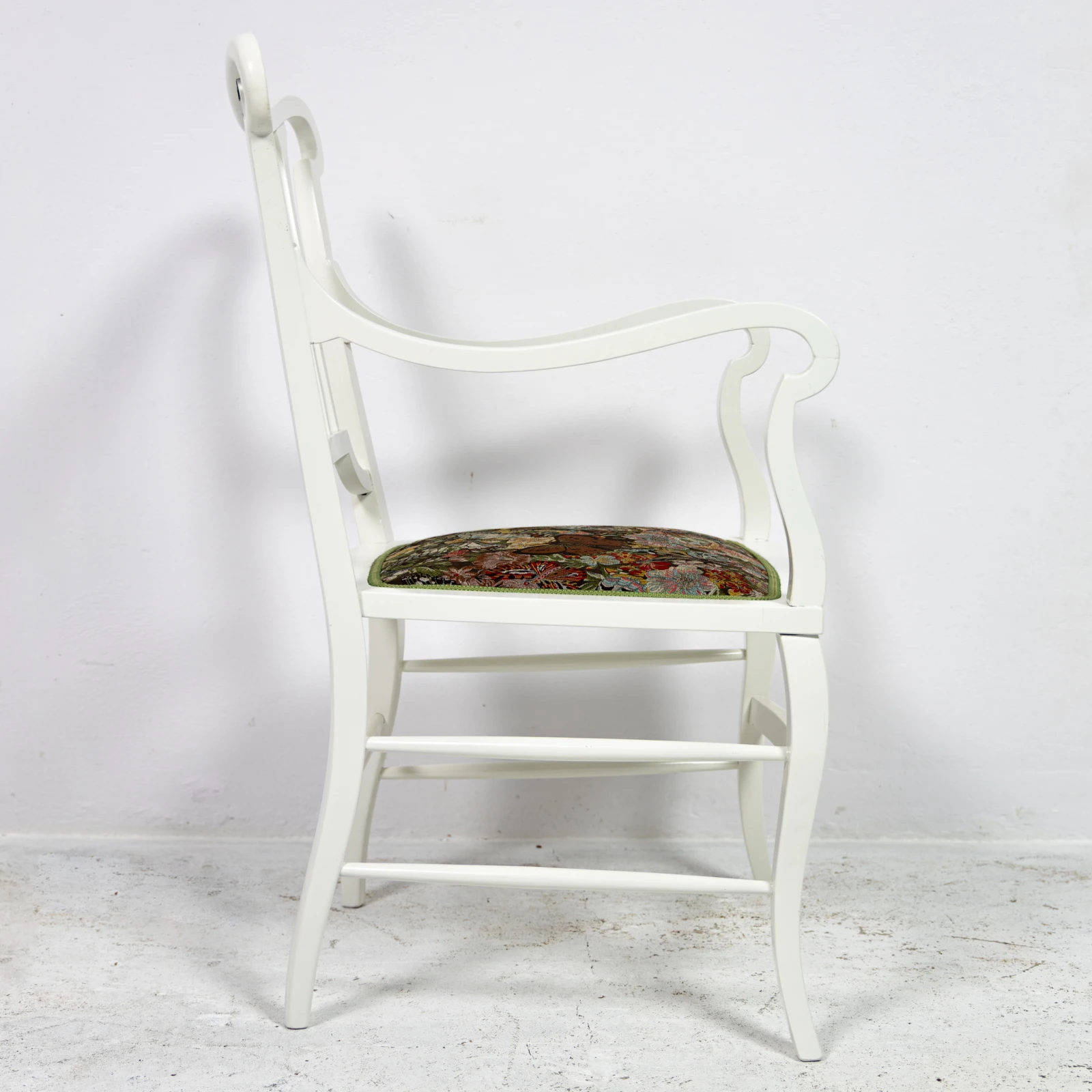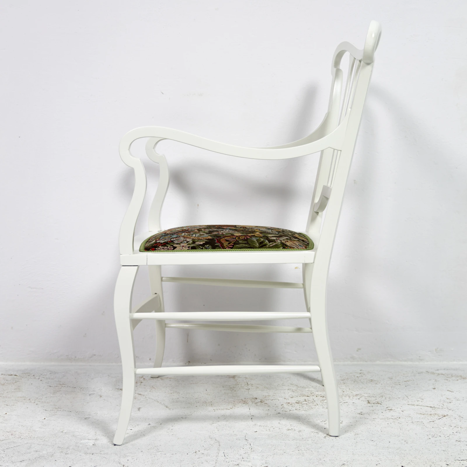 Prezentujemy Państwu komplet dwóch foteli, będących przykładem niemieckiego Jugendstilu (secesji) z lat 1900–1920. Te rzadko spotykane meble łączą w sobie organiczną lekkość wczesnej secesji z geometrycznym ładem jej późniejszej fazy. Wykończone w szlachetnej, czystej bieli, stanowią idealną propozycję dla osób poszukujących antyków, które nie przytłaczają wnętrza, lecz nadają mu jasności i nowoczesnego sznytu.