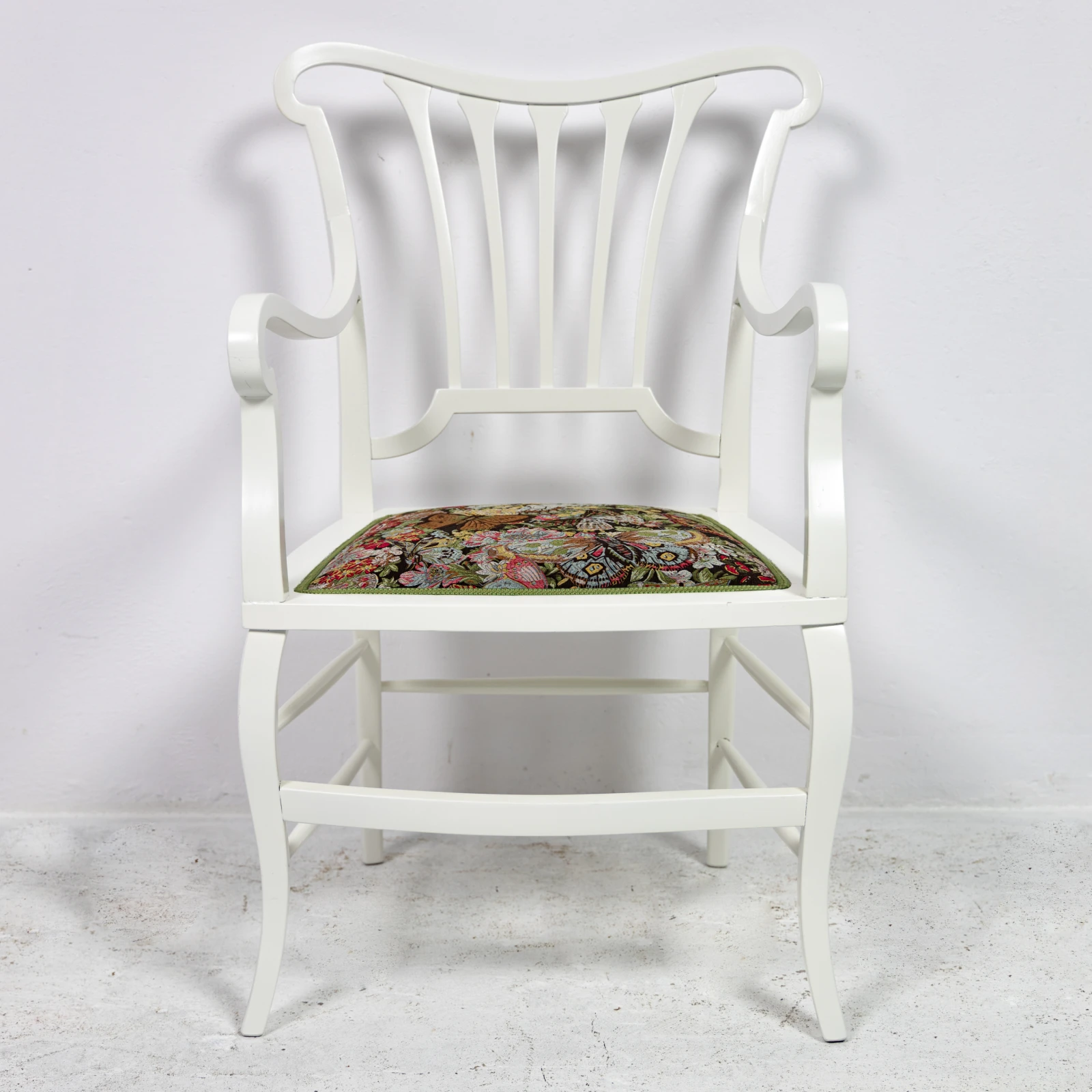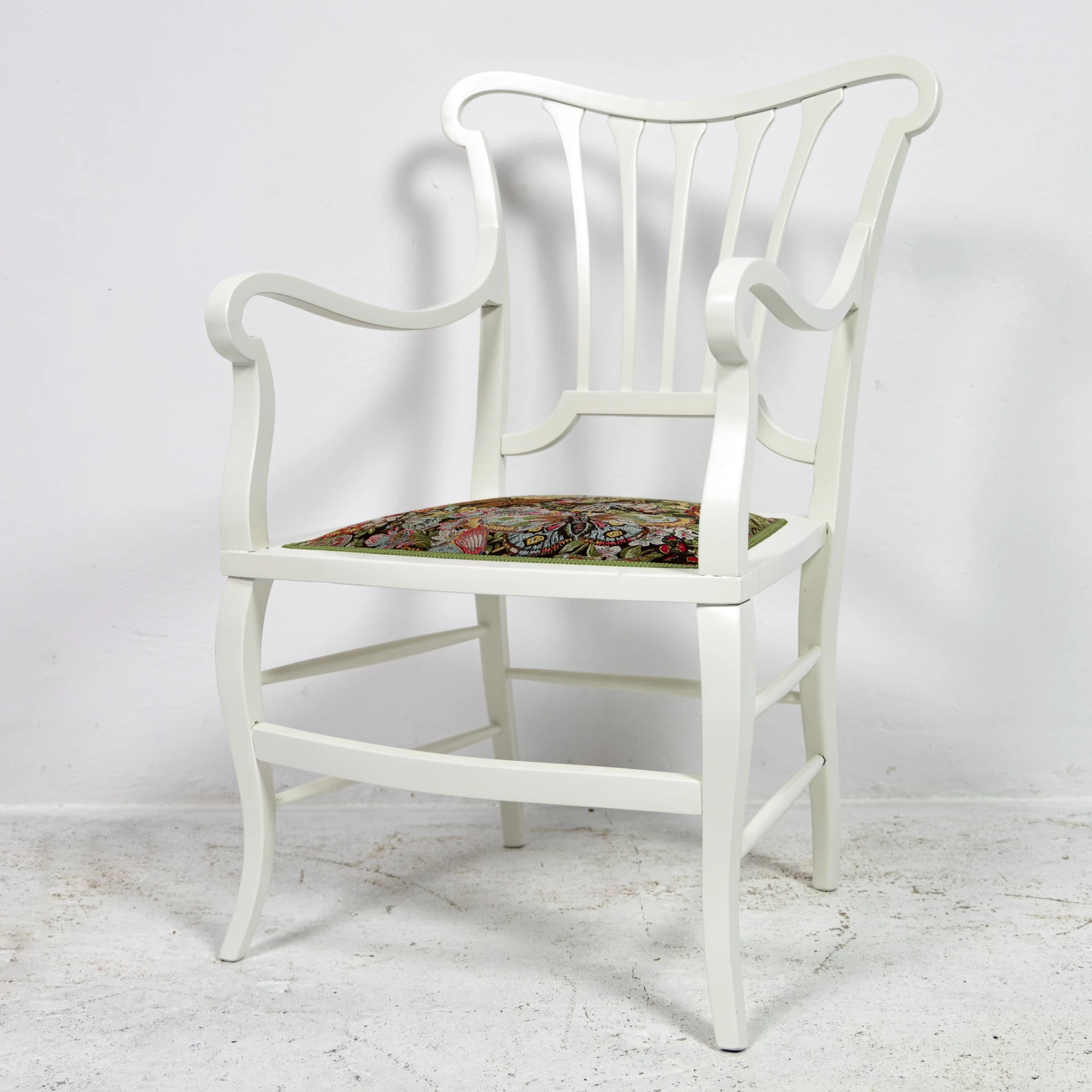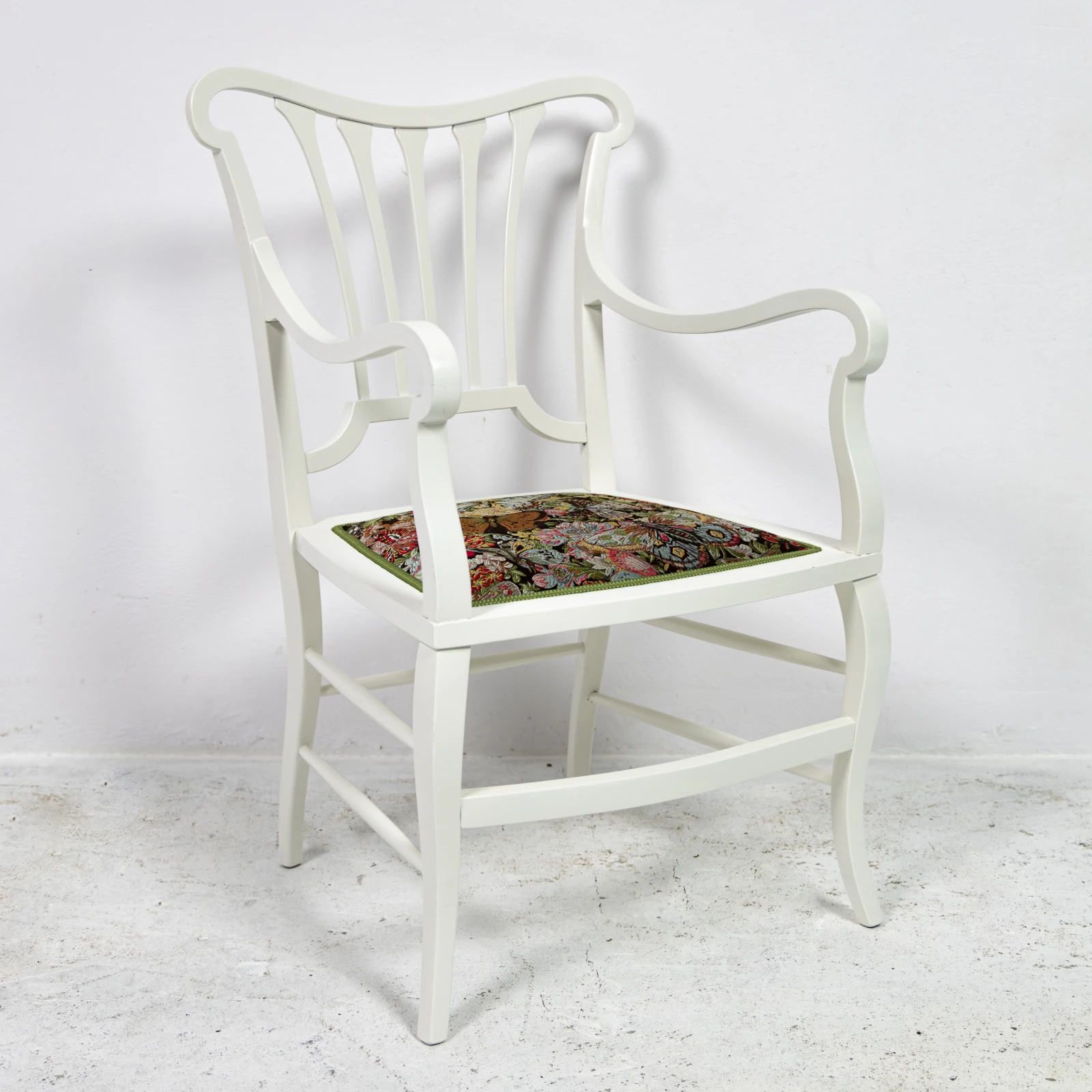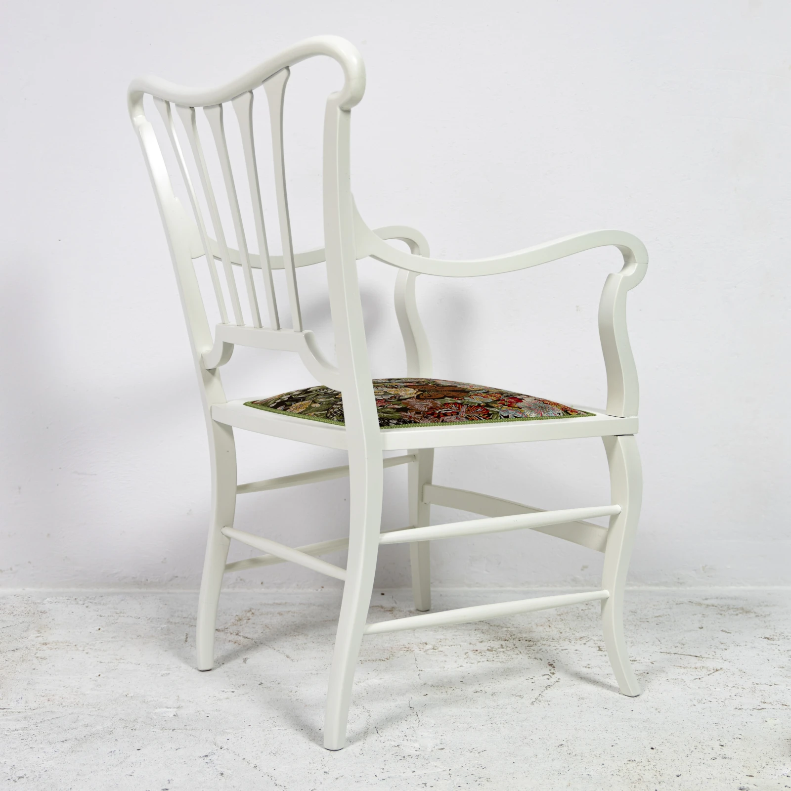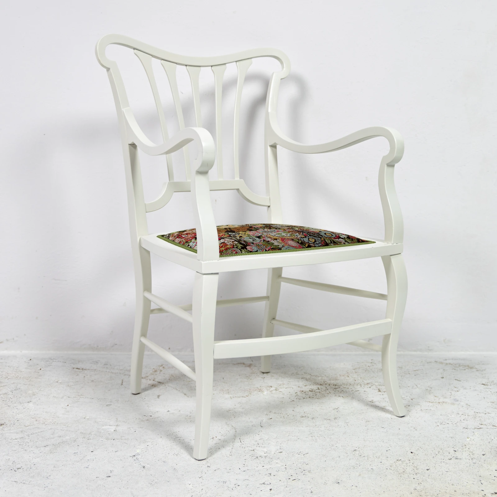 Prezentujemy Państwu komplet dwóch foteli, będących przykładem niemieckiego Jugendstilu (secesji) z lat 1900–1920. Te rzadko spotykane meble łączą w sobie organiczną lekkość wczesnej secesji z geometrycznym ładem jej późniejszej fazy. Wykończone w szlachetnej, czystej bieli, stanowią idealną propozycję dla osób poszukujących antyków, które nie przytłaczają wnętrza, lecz nadają mu jasności i nowoczesnego sznytu.