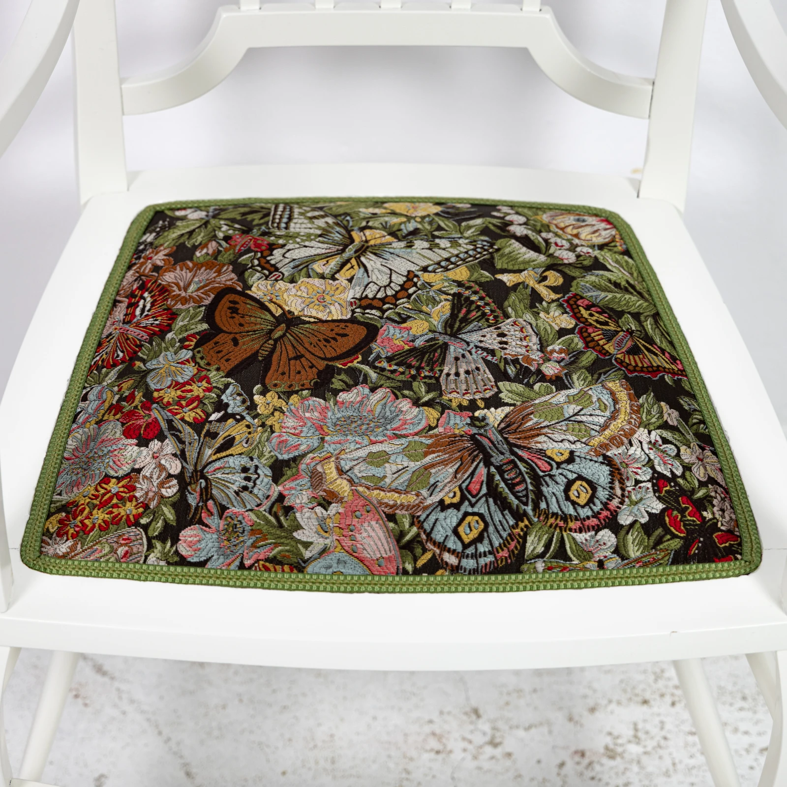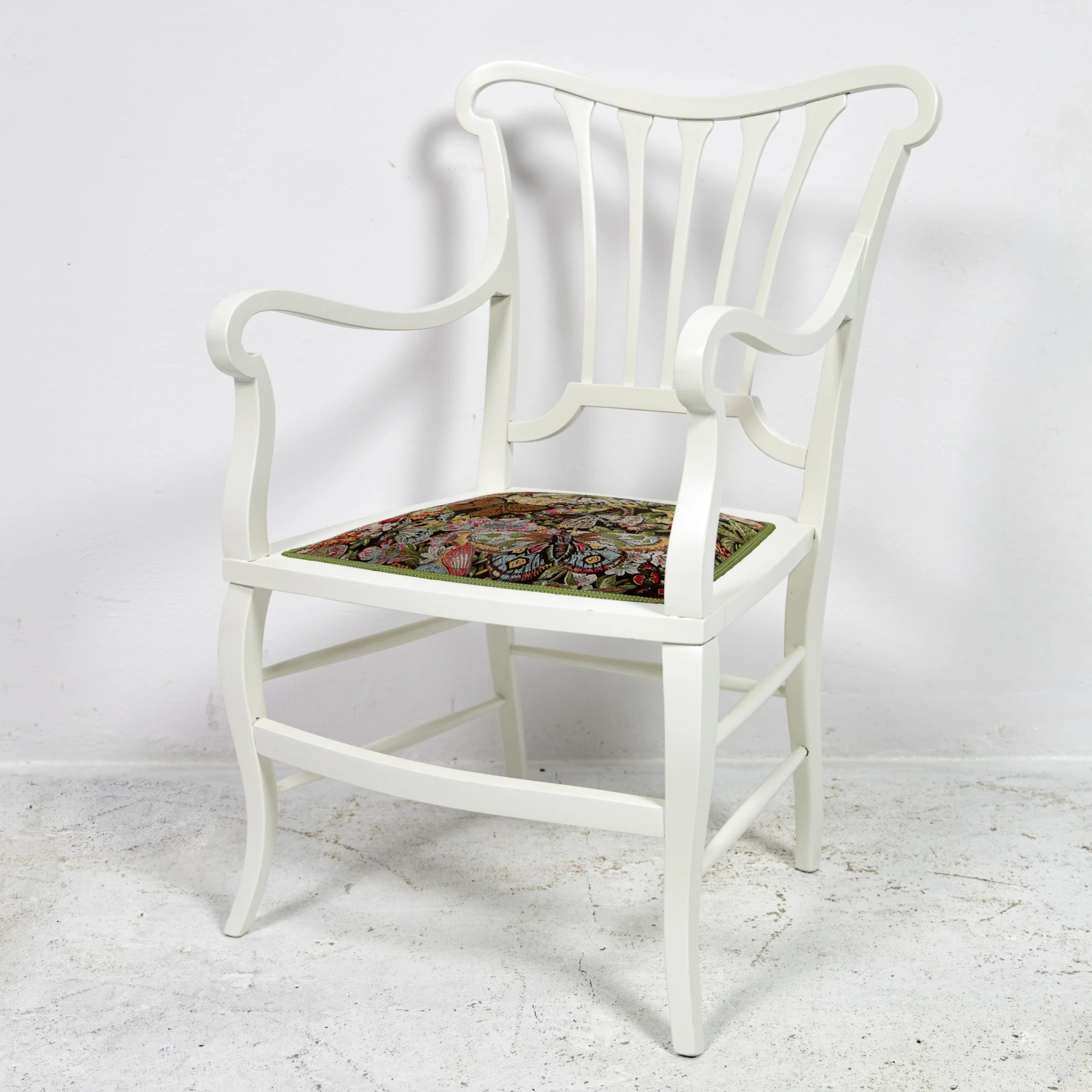 - Siedziska zdobi wysokogatunkowy gobelin z motywem motyli. W epoce Art Nouveau motyl był jednym z najważniejszych symboli – uosabiał duszę, przemianę oraz ulotne piękno natury. Intensywne barwy wzoru tworzą spektakularny kontrast z jasną ramą mebla.