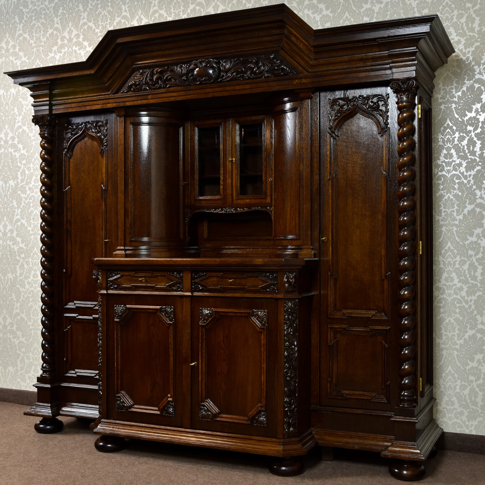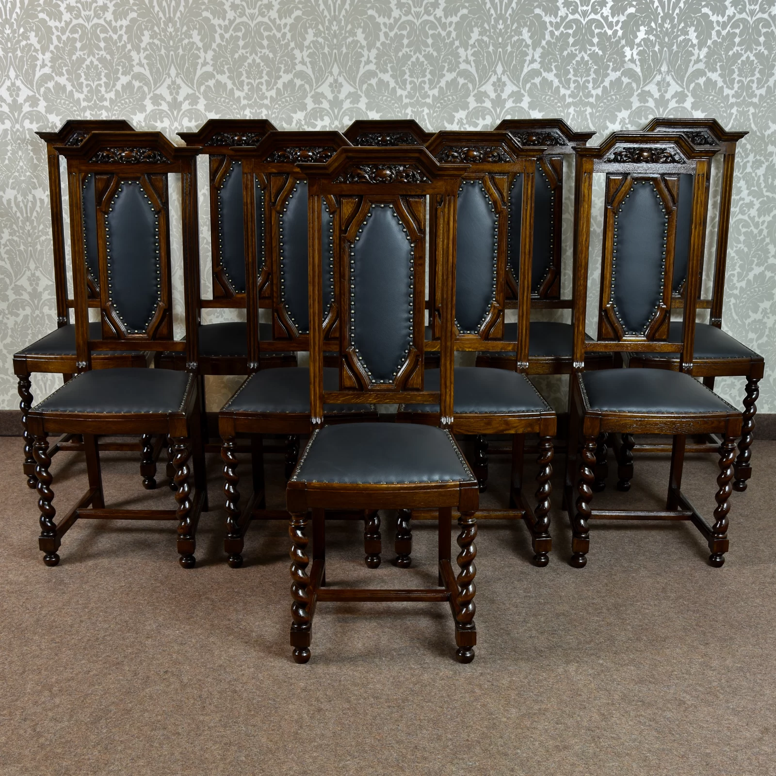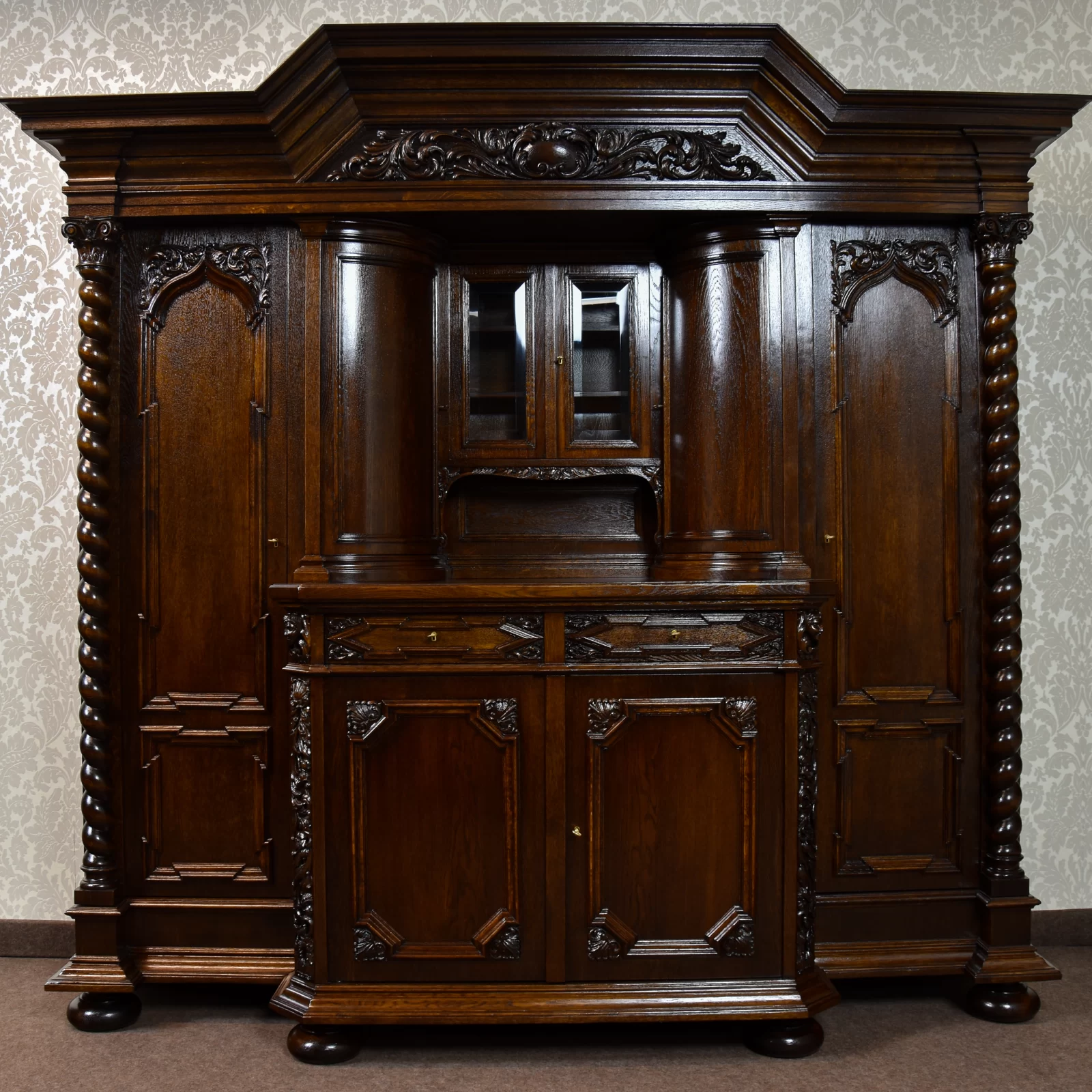 Niezwykły komplet mebli w stylu neobarokowym, w skład którego wchodzi kredens, komoda (pomocnik), okrągły stół i dziesięć krzeseł.