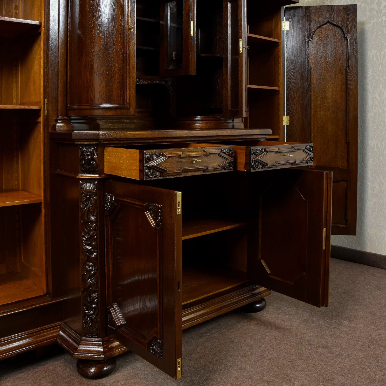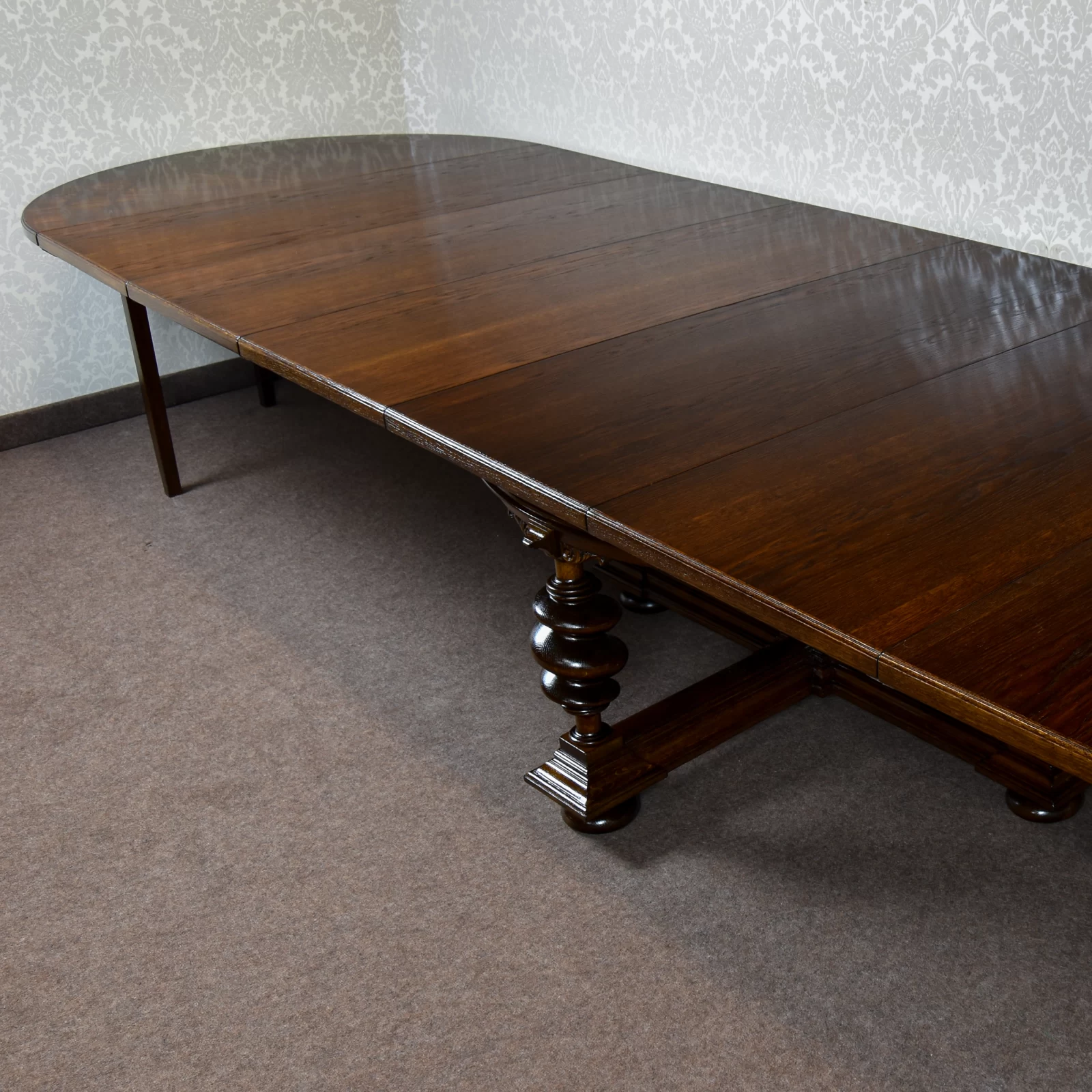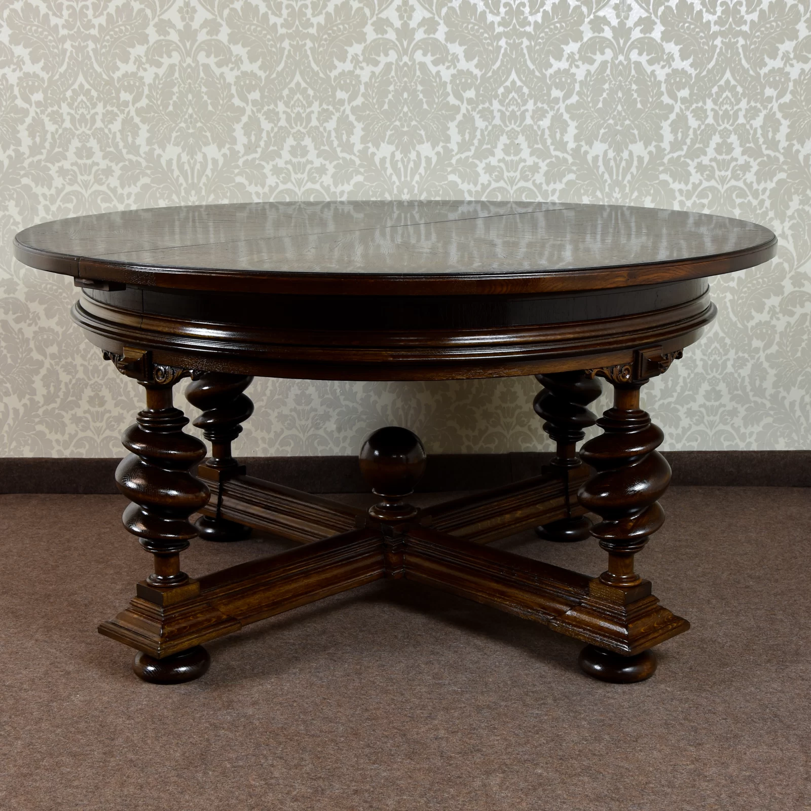 Niezwykły komplet mebli w stylu neobarokowym, w skład którego wchodzi kredens, komoda (pomocnik), okrągły stół i dziesięć krzeseł.