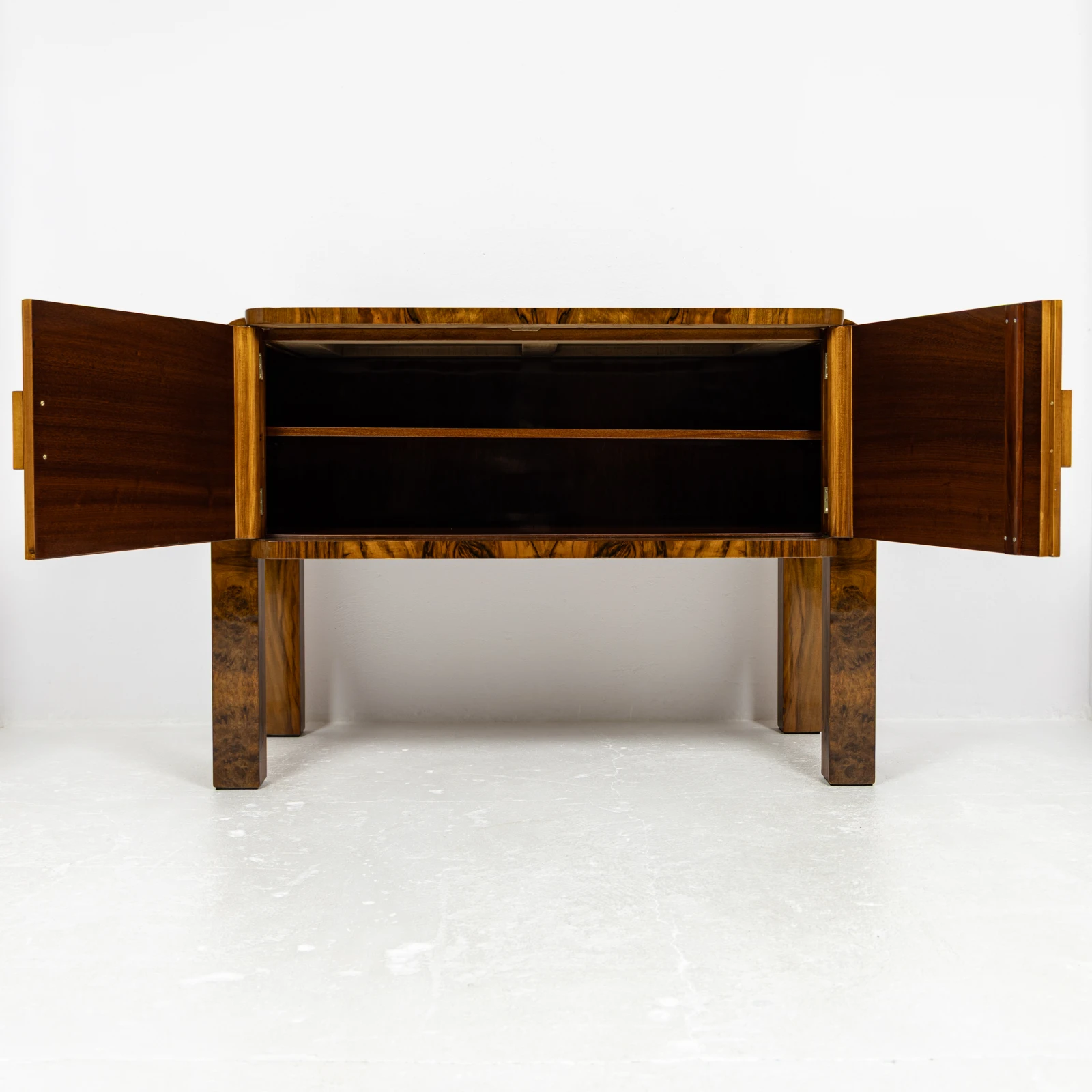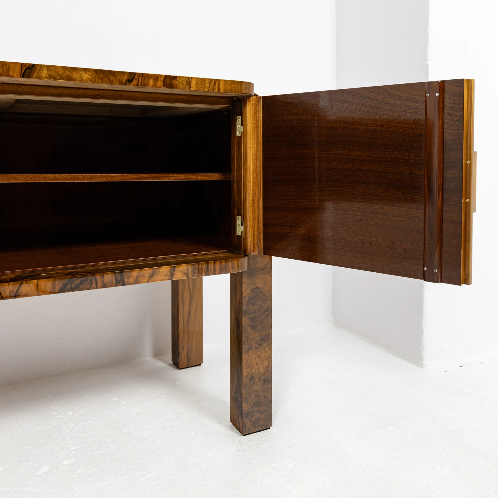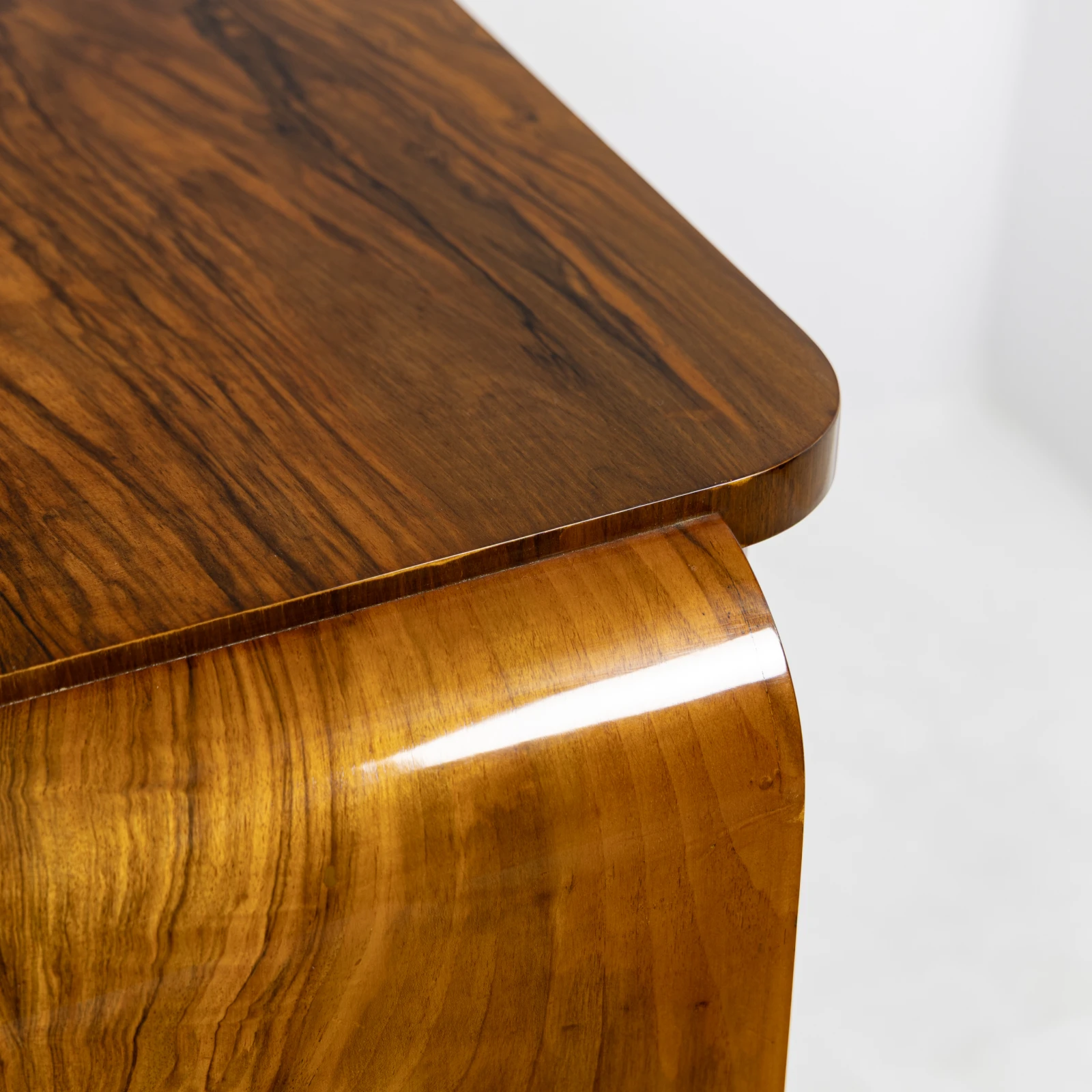 Masywna, monolityczna bryła posadowiona jest na charakterystycznych dla stylu zaokrąglonych bokach, które płynnie przechodzą w wysokie, fornirowane nogi. Taka konstrukcja, łącząca gięte elementy z prosta formą nóg, nadaje meblowi lekkości i nowoczesnej elegancji, zachowując jego monumentalny charakter.