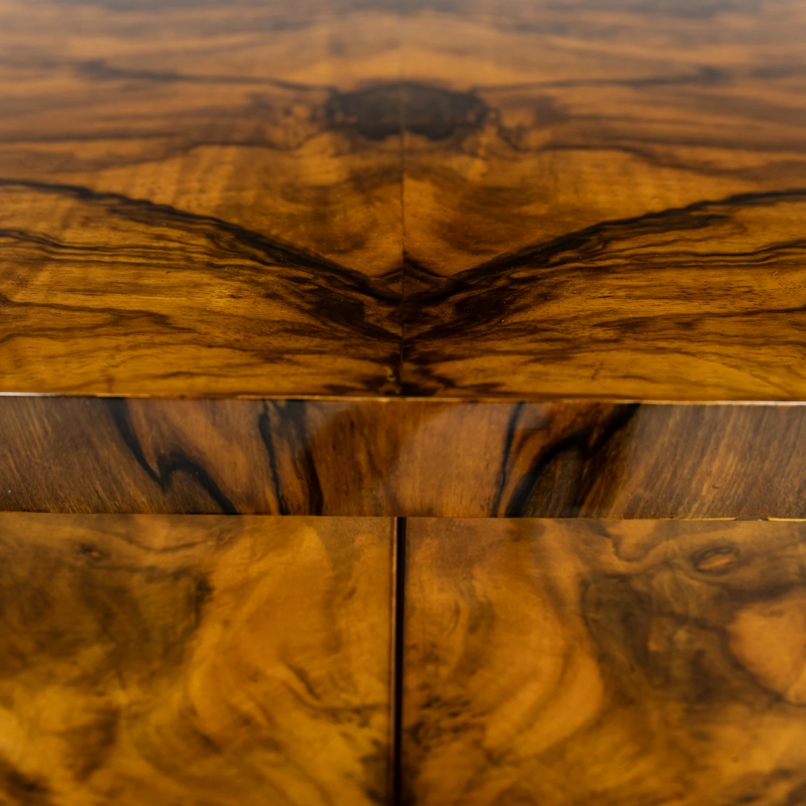 Komoda przyciąga wzrok dekoracyjnym, bardzo wzorzystym fornirem z orzecha europejskiego oraz cenionego orzecha z korzenia. Fornir został ułożony metodą symetrycznego, lustrzanego odbicia, tworząc na drzwiach, blacie i bokach dynamiczne, geometryczne wzory, które są esencją stylu Art Deco.