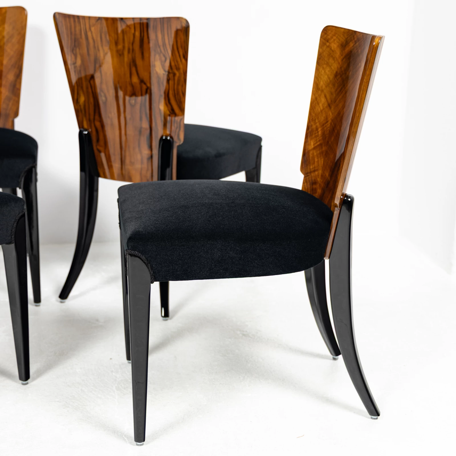 Konstrukcja krzeseł to połączenie materiałów wysokiej jakości. Solidne, czarno wybarwione bukowe nogi stanowią kontrast dla oparć oklejonych szlachetnym fornirem orzechowym, podkreślając naturalne piękno drewna. Całość została zabezpieczona wieloma warstwami lakieru polerowanego na wysoki połysk, co gwarantuje nie tylko trwałość, ale i wyjątkowy, lśniący wygląd.