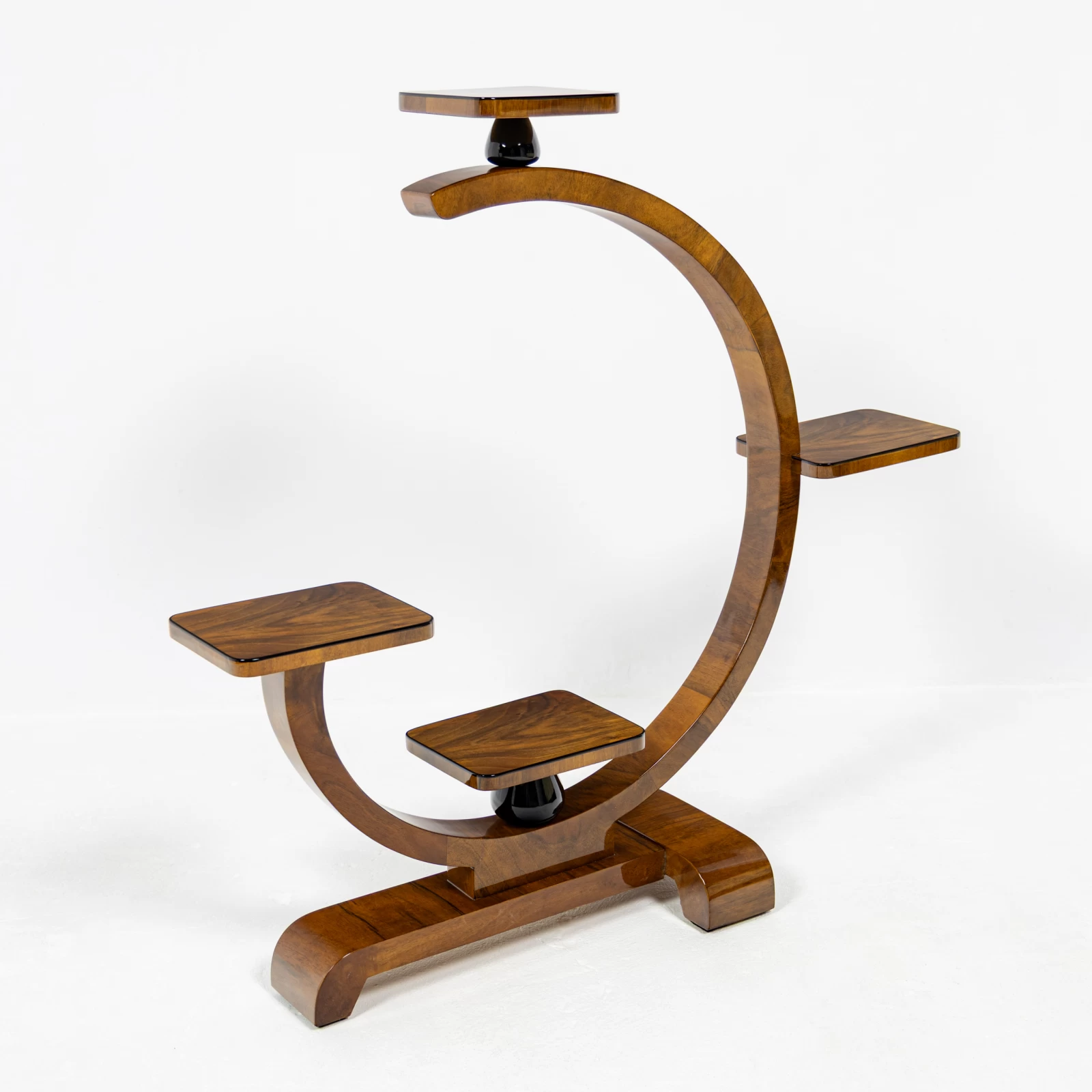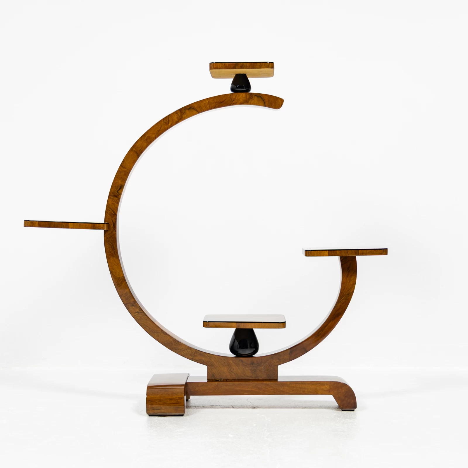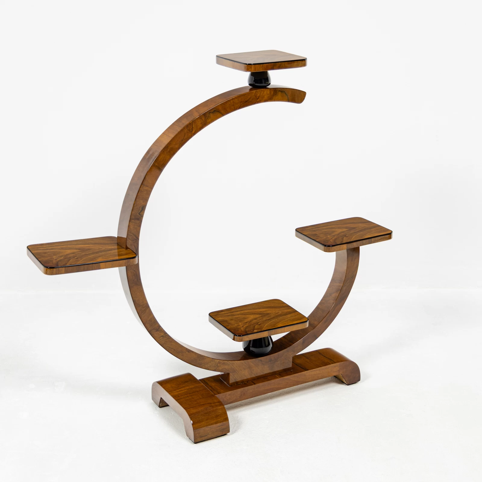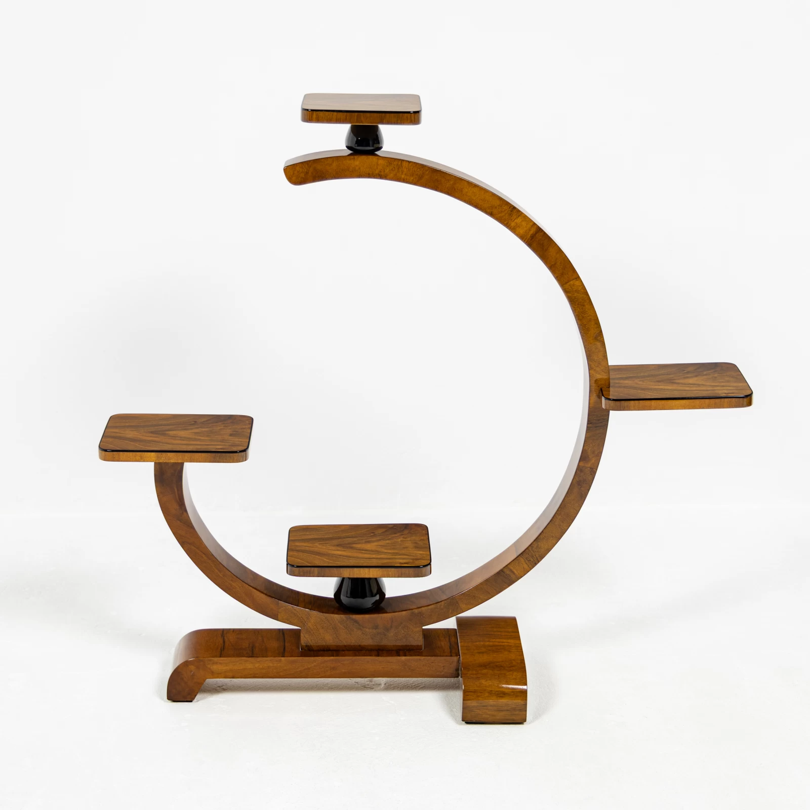 Konstrukcja mebla oparta jest na figurze geometrycznej – kole, w którą harmonijnie wkomponowano półki, idealnie pełniące funkcję podstaw pod doniczki z kwiatami. Kwietnik wyróżnia się dwiema symetrycznie ułożonymi w pionie, czarnymi toczonymi podpórkami z drewna liściastego. Dodają mu one lekkości i geometrycznego charakteru, typowego dla Art Deco. Każda z półek została ozdobiona delikatną czarną oblamówką, która spójnie podkreśla styl i nadaje całości wyjątkowy charakter.