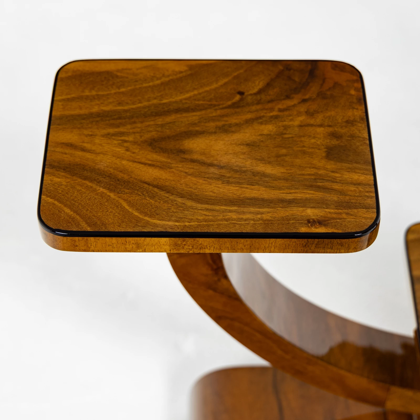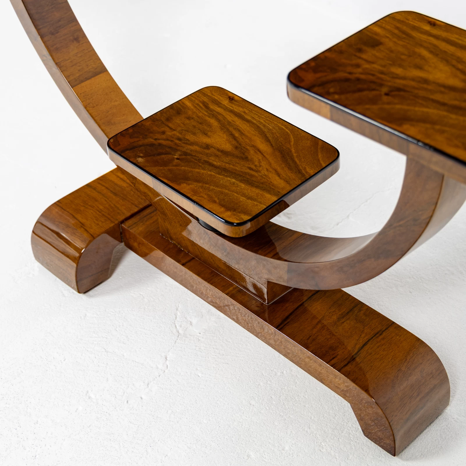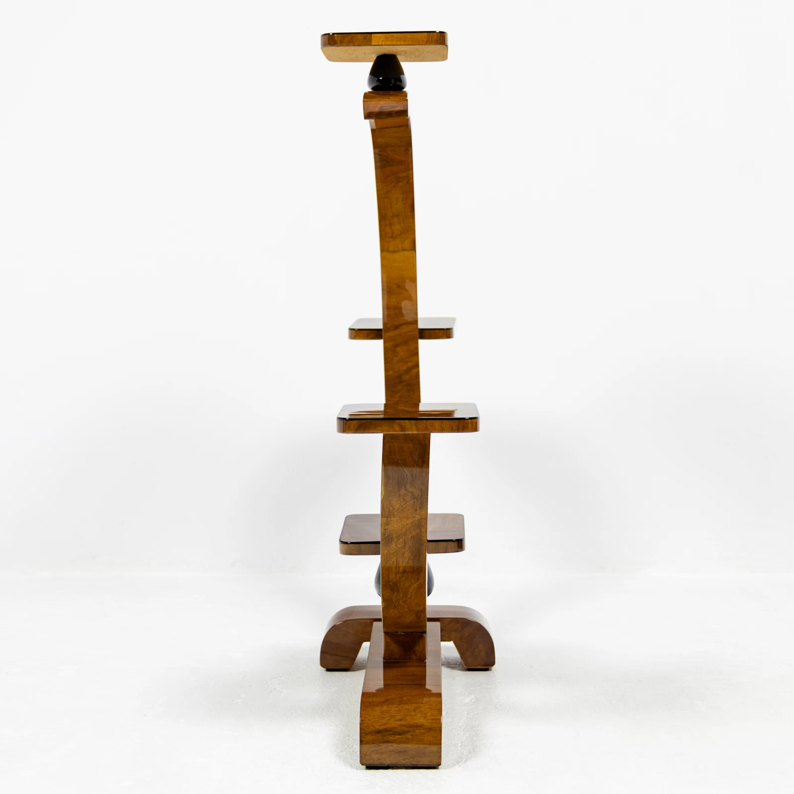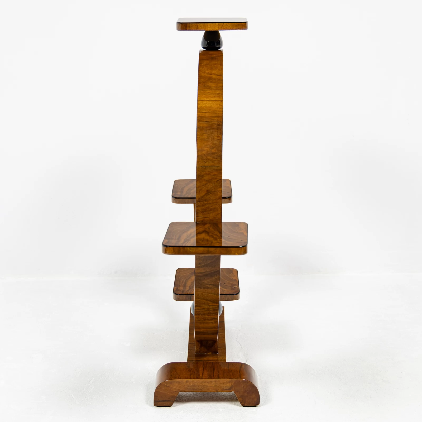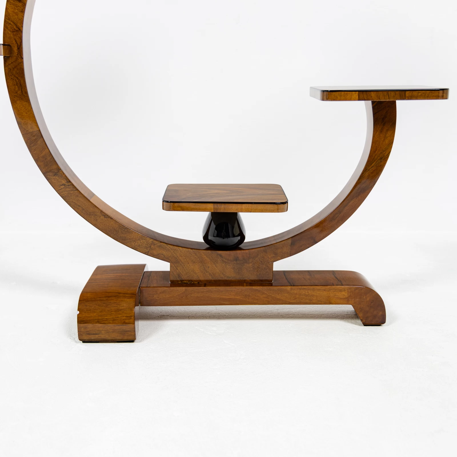 Konstrukcja mebla oparta jest na figurze geometrycznej – kole, w którą harmonijnie wkomponowano półki, idealnie pełniące funkcję podstaw pod doniczki z kwiatami. Kwietnik wyróżnia się dwiema symetrycznie ułożonymi w pionie, czarnymi toczonymi podpórkami z drewna liściastego. Dodają mu one lekkości i geometrycznego charakteru, typowego dla Art Deco. Każda z półek została ozdobiona delikatną czarną oblamówką, która spójnie podkreśla styl i nadaje całości wyjątkowy charakter.