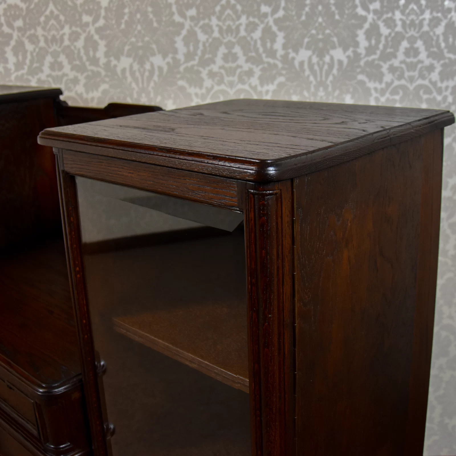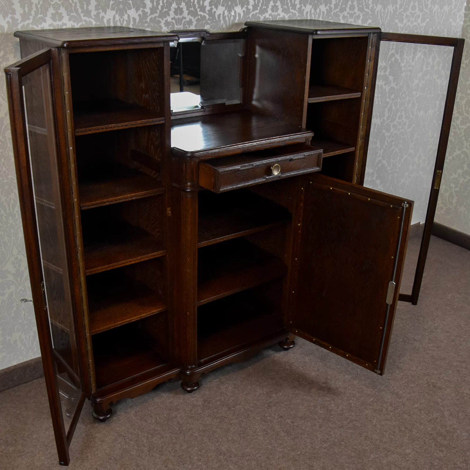Mebel wyróżnia się bocznymi, przeszklonymi kolumnami, które pełnią funkcję witryn. Ich szyby są fazowane i nowe, co dodaje im elegancji i zapewnia doskonałą przejrzystość. Lustro w centralnej części kredensu, choć nosi drobne rysy i odbarwienia, nie przeszkadza to w jego użytkowaniu i jest świadectwem historii mebla.