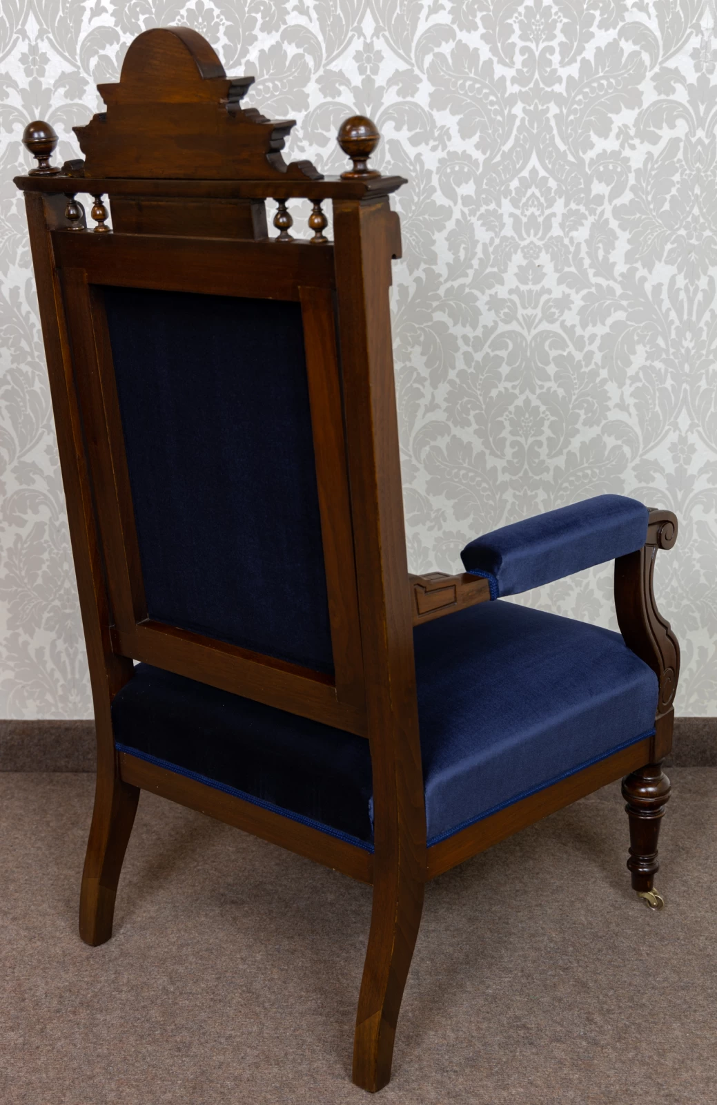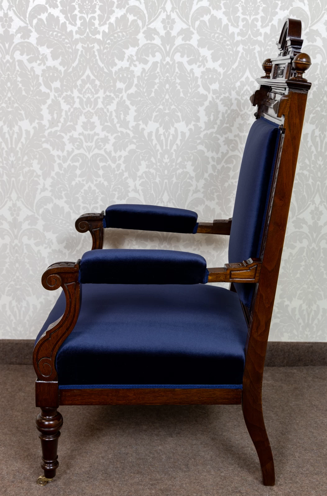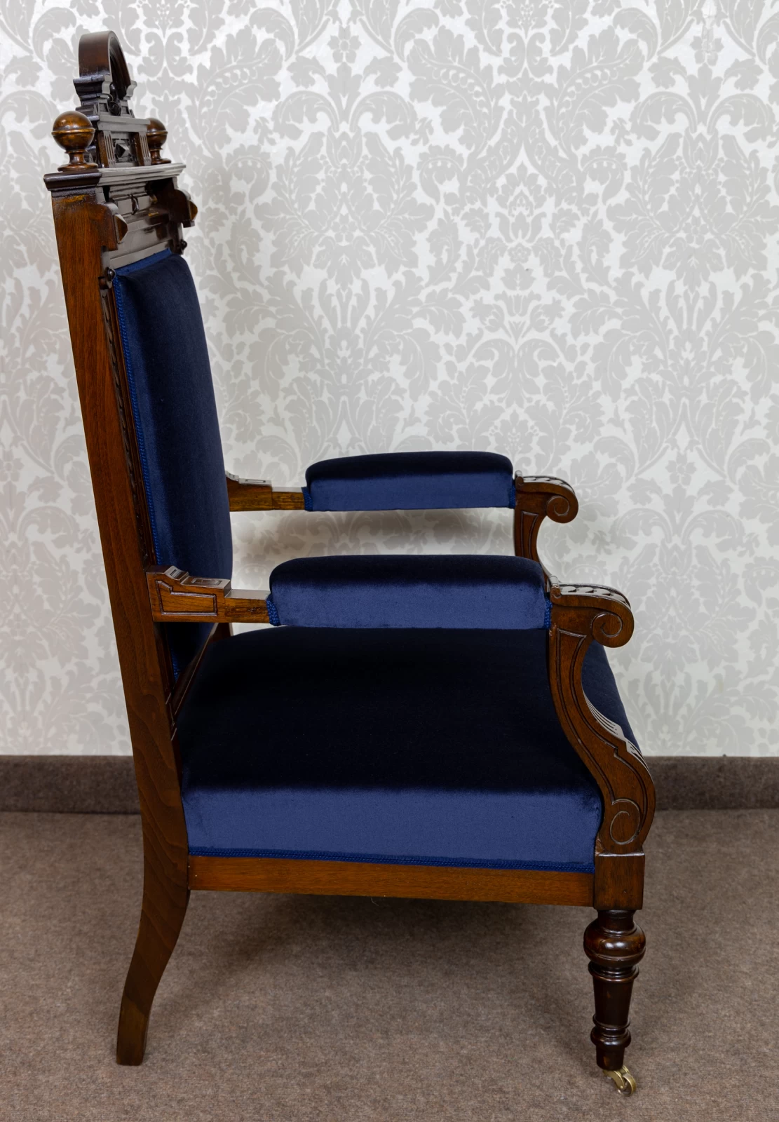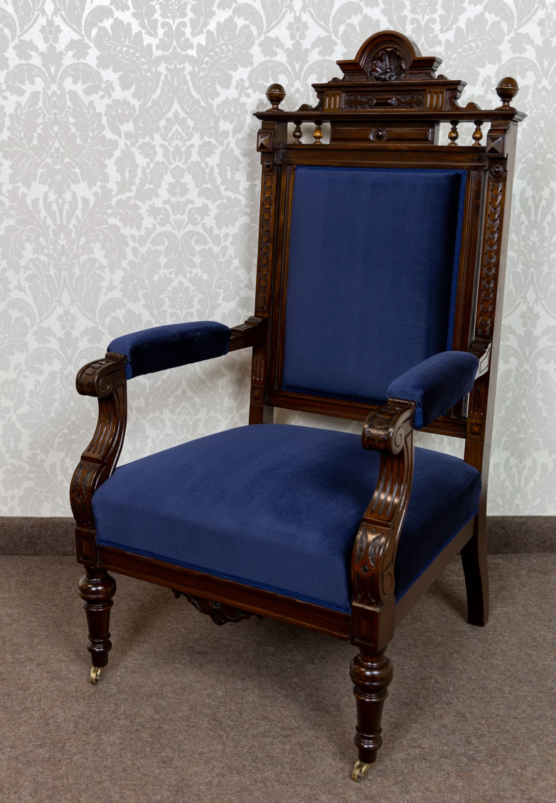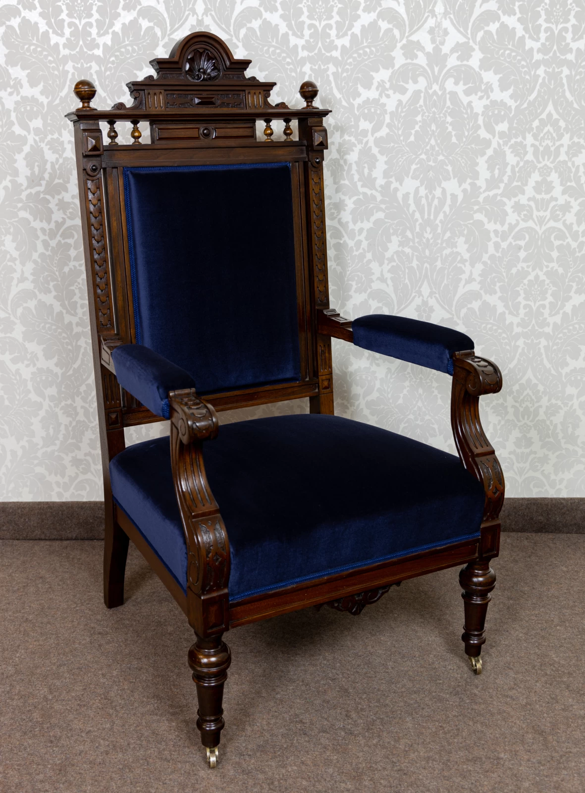 Prezentujemy elegancki fotel neorenesansowy, datowany na lata 80-90 XIX wieku, pochodzący z Niemiec, z czasów tzw. epoki kajzerowskiej. Ten mebel jest doskonałym przykładem stylu, który łączył w sobie solidność z bogactwem zdobień, typowym dla ówczesnych zamożnych wnętrz. Będzie wspaniałym uzupełnieniem salonu, gabinetu czy biblioteki.