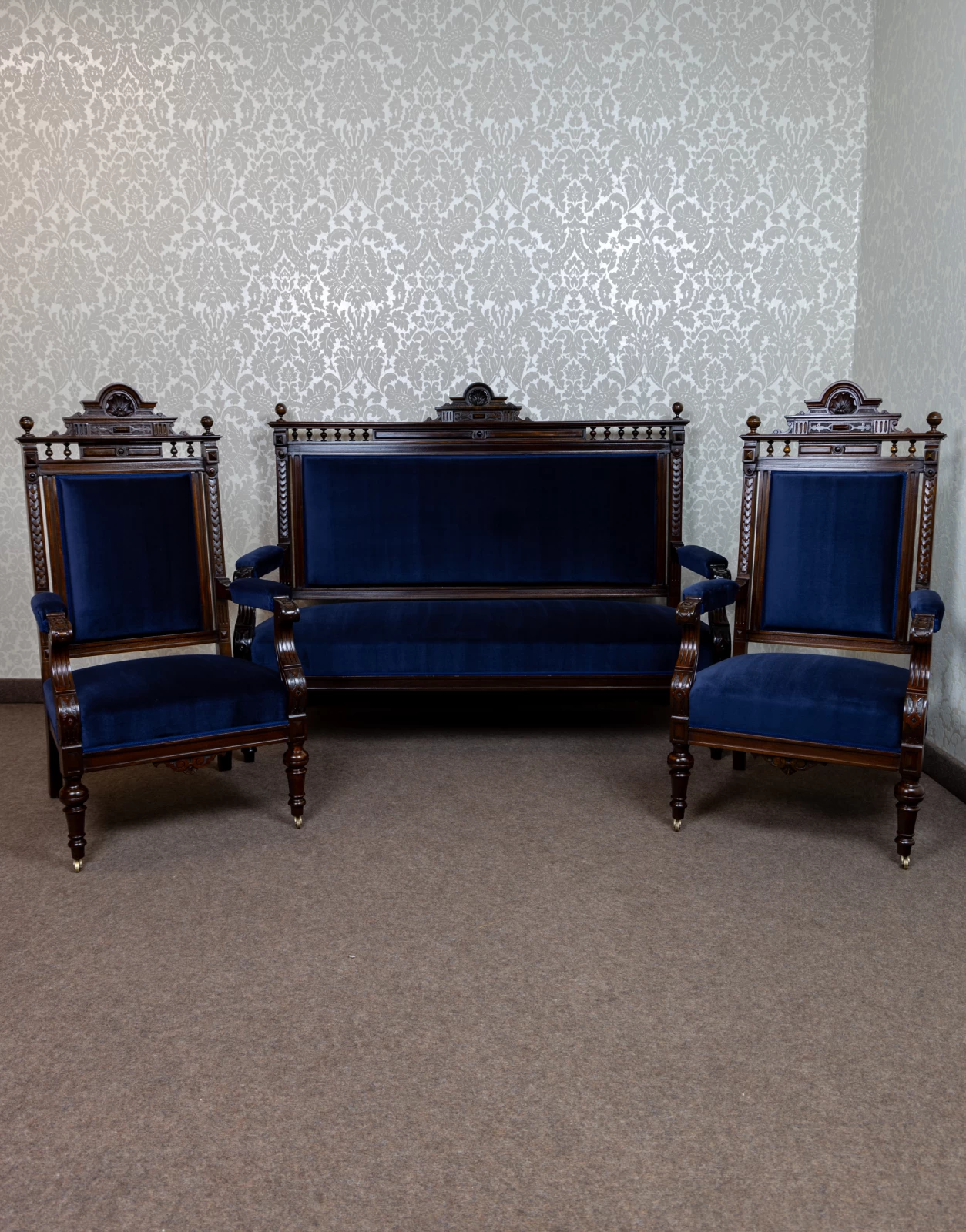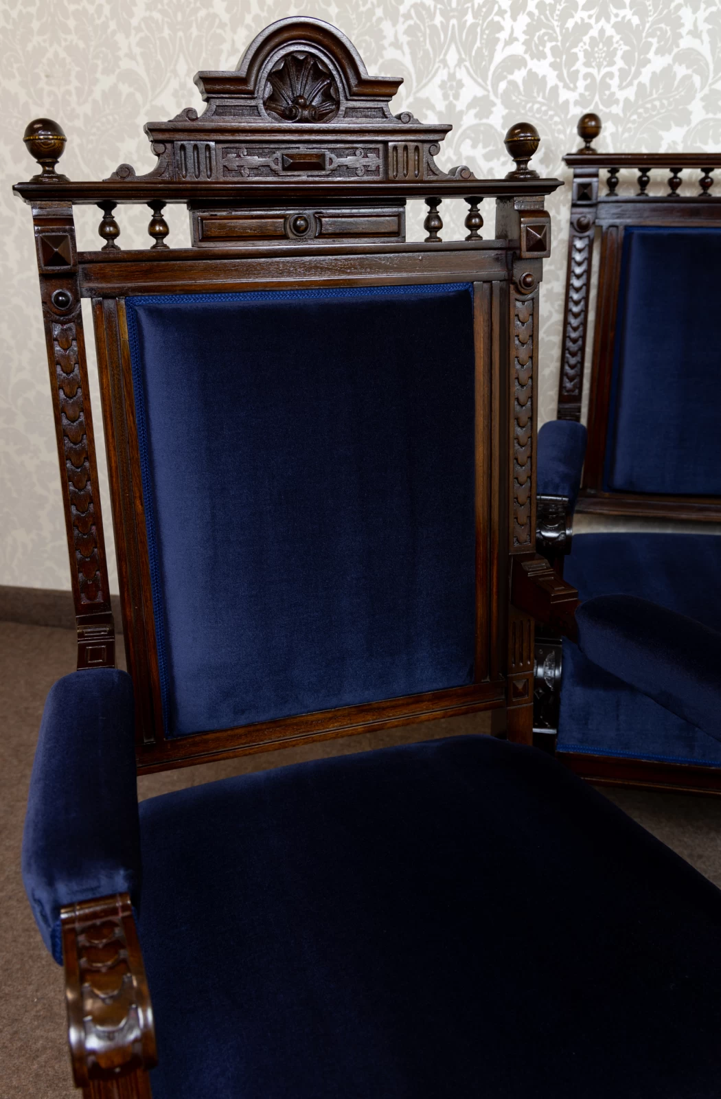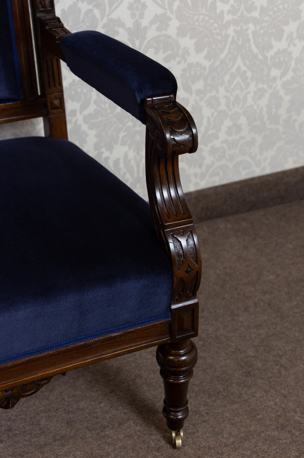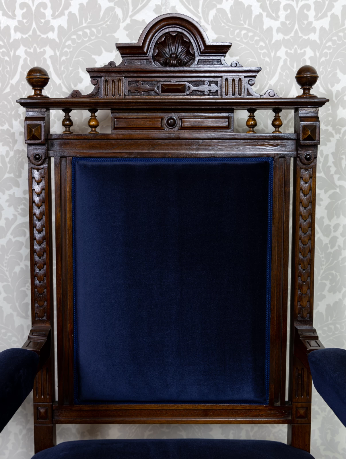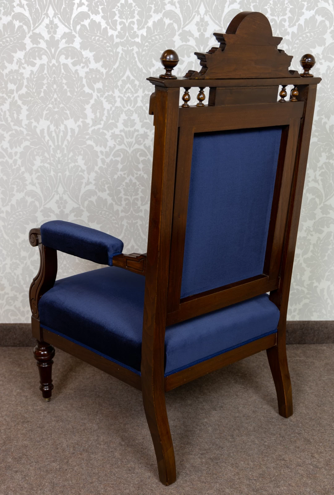 Prezentujemy elegancki fotel neorenesansowy, datowany na lata 80-90 XIX wieku, pochodzący z Niemiec, z czasów tzw. epoki kajzerowskiej. Ten mebel jest doskonałym przykładem stylu, który łączył w sobie solidność z bogactwem zdobień, typowym dla ówczesnych zamożnych wnętrz. Będzie wspaniałym uzupełnieniem salonu, gabinetu czy biblioteki.