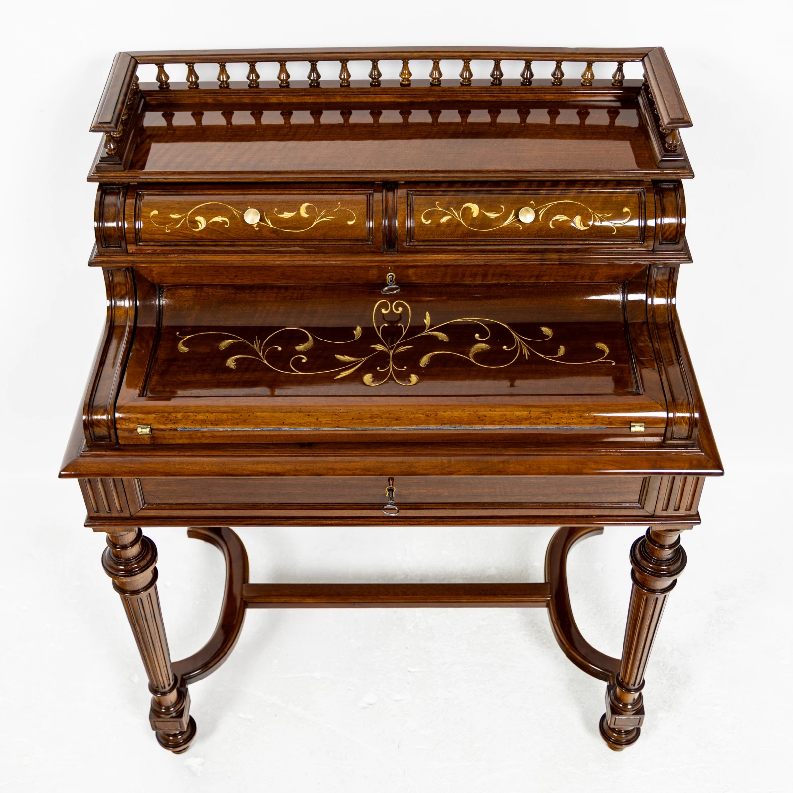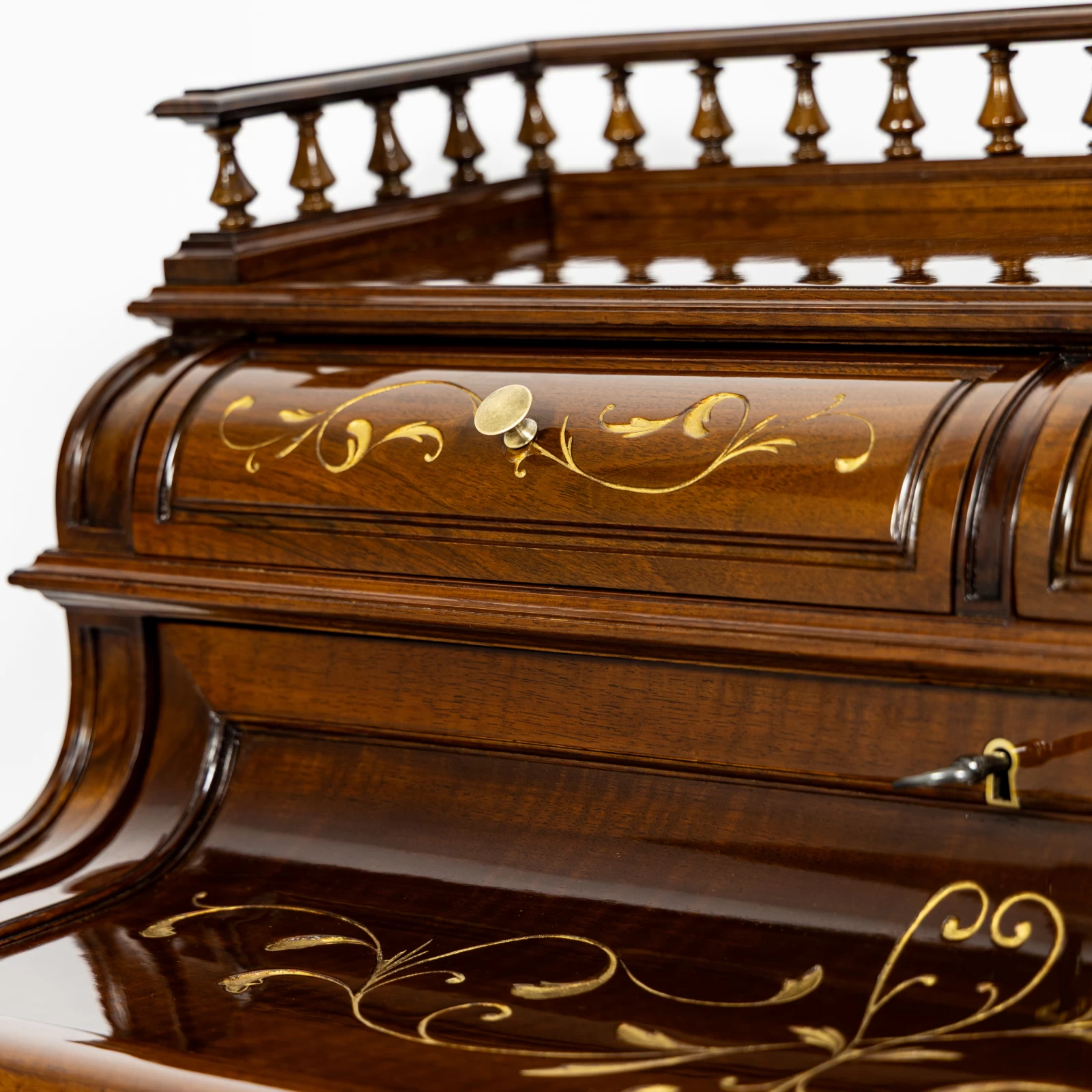 Patrząc od góry, sekretarzyk posiada trójstronną drewnianą galeryjkę, która dodaje mu uroku. Poniżej znajdują się dwie szufladki z ukośnymi frontami, idealne na listy i drobne dokumenty. Za wygiętym korpusem, ozdobionym wspomnianymi złoconymi motywami, kryje się wysuwany i rozkładany blat do pisania, wyłożony eleganckim niebieskim suknem, co zapewnia wygodną powierzchnię do pracy. Pod blatem tym znajdziemy dwie dodatkowe szufladki. Na samym dole mebla umieszczono największą, zamykaną na klucz szufladę, oferującą dyskretne miejsce do przechowywania.