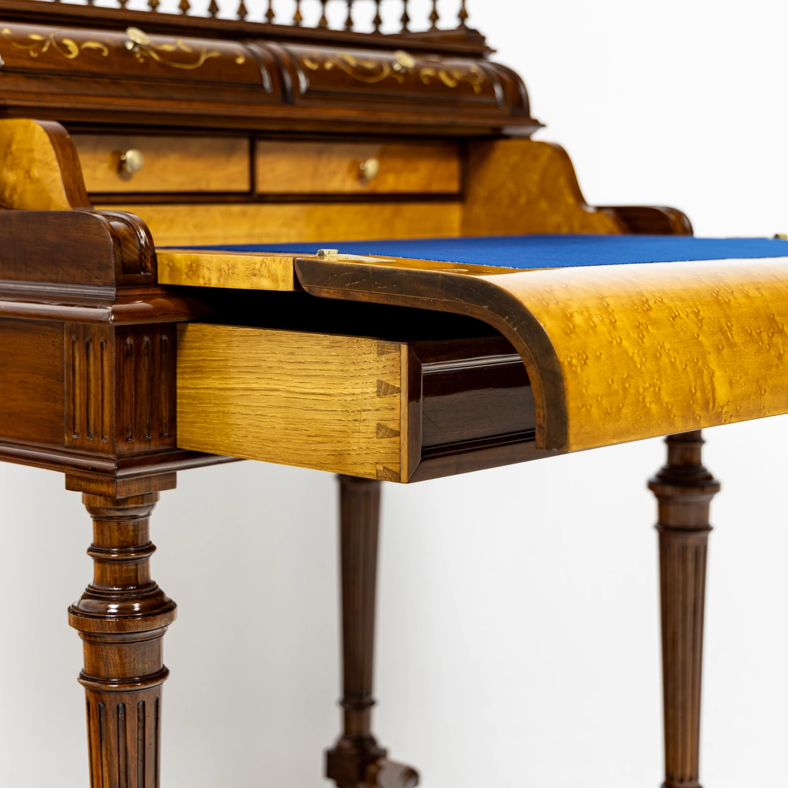 Sekretarzyk wykonano z wysokiej jakości materiałów. Główna konstrukcja i fornirowanie zewnętrzne to szlachetne drewno orzechowe. Konstrukcję szuflad wykonano z solidnego drewna dębowego, co świadczy o jakości. Wnętrze skrytek i szuflad zostało wyłożone rzadkim i efektownym fornirem z klonu "ptasie oko", dodając całości bogatego charakteru. Całość wykończono politurowanym szelakiem na wysoki połysk, co wydobywa głębię koloru i piękne usłojenie drewna. Dodatkowym elementem dekoracyjnym są złocone motywy liści, które subtelnie zdobią zaokrąglony korpus, podkreślając elegancję stylu.
