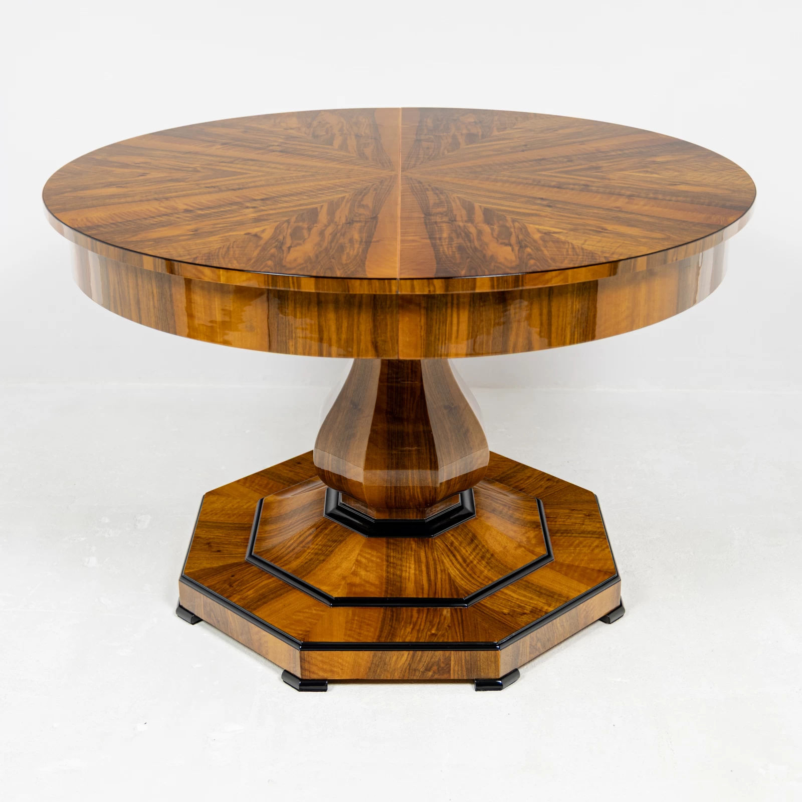 Stół wsparty jest na solidnej, wielobocznej kolumnie, umieszczonej na ośmiokątnej platformie, co nadaje mu charakteru. Mebel fornirowano orzechem europejskim.