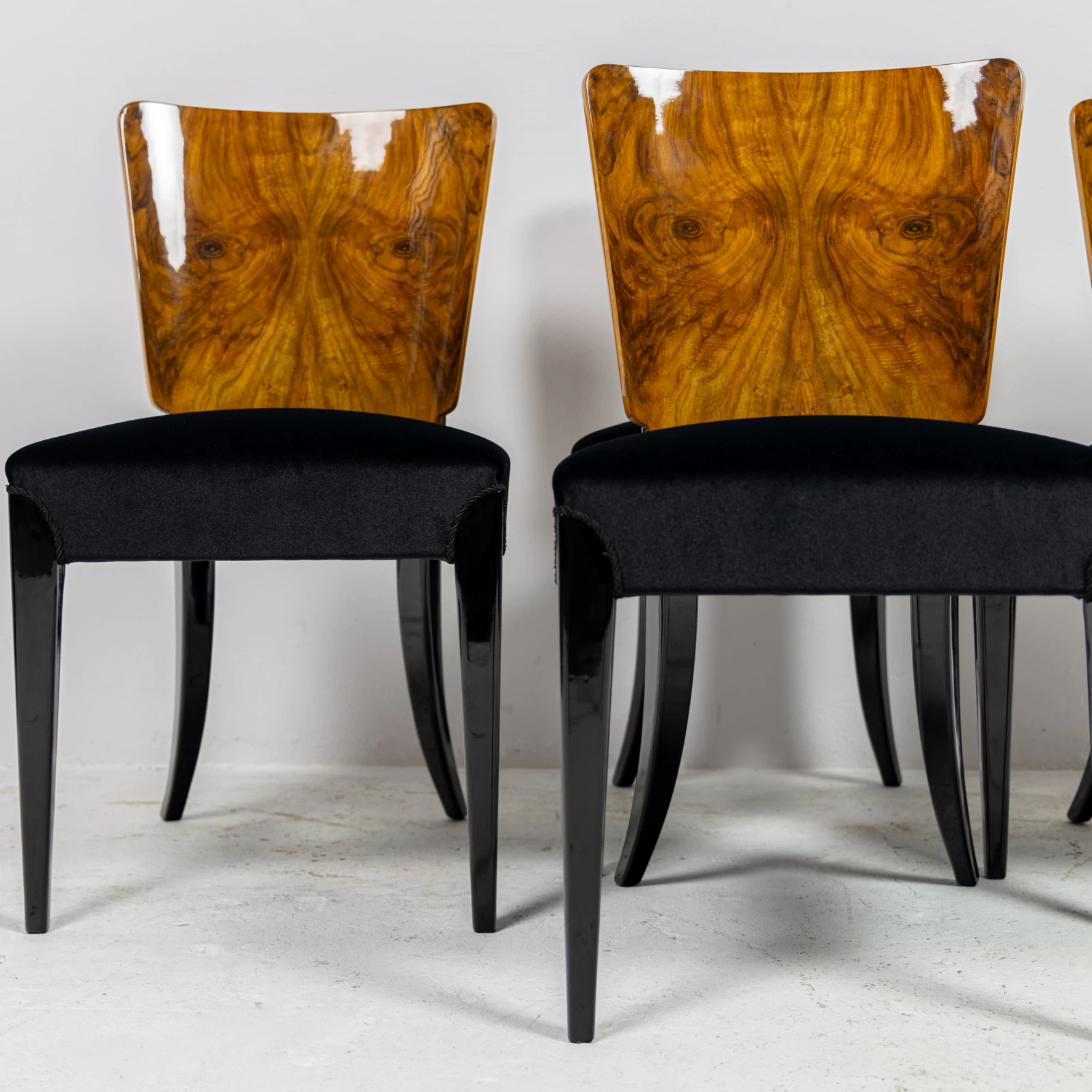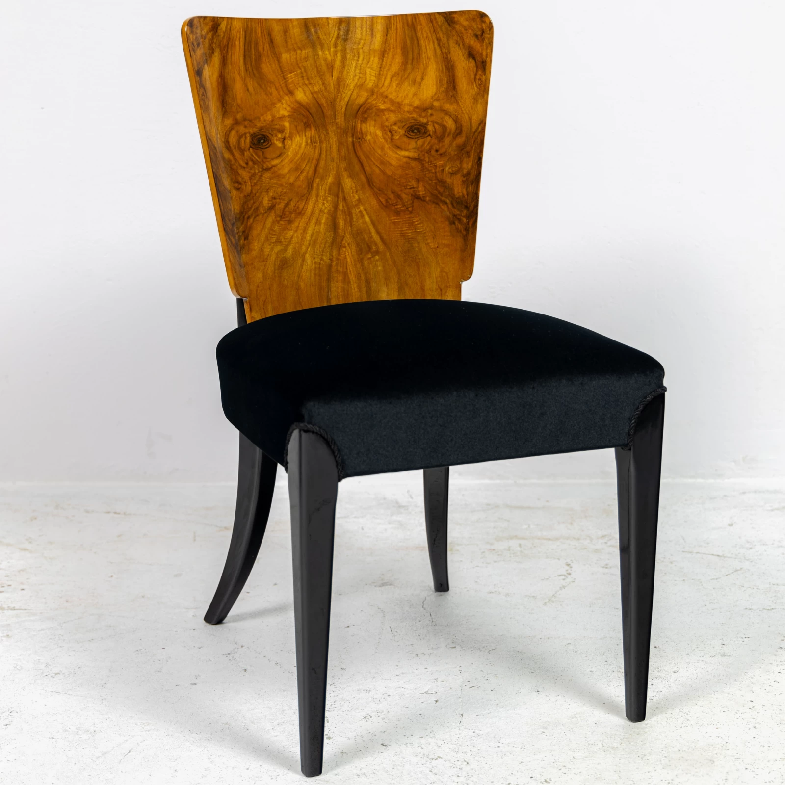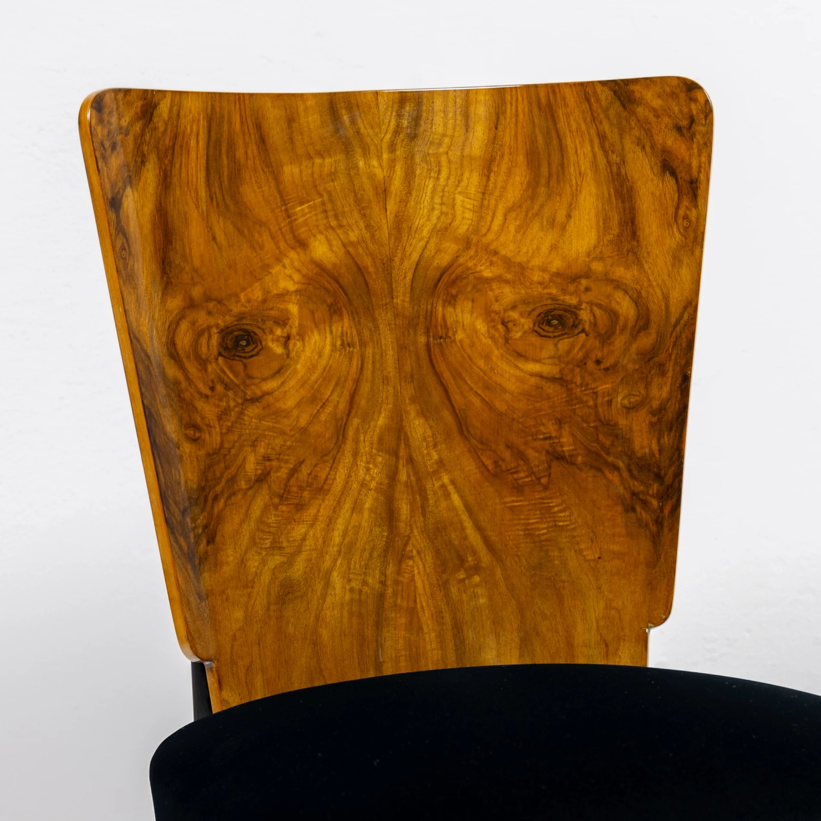 Blat stołu i oparcie krzeseł fornirowane orzechem na konstrukcji drewna liściastego. Nogi są bukowe i pomalowane na kolor czarny. Całość wykończona polerowanym lakierem na wysoki połysk. Zmieniono kolorystykę, uzyskując ciekawe połączenie elementów czarnych z usłojeniem drewna orzechowego.