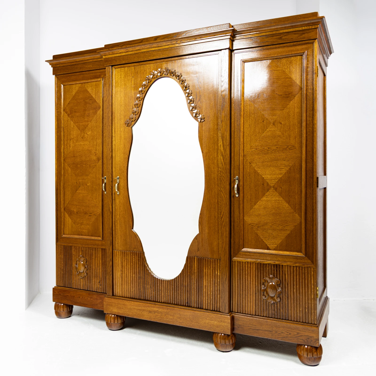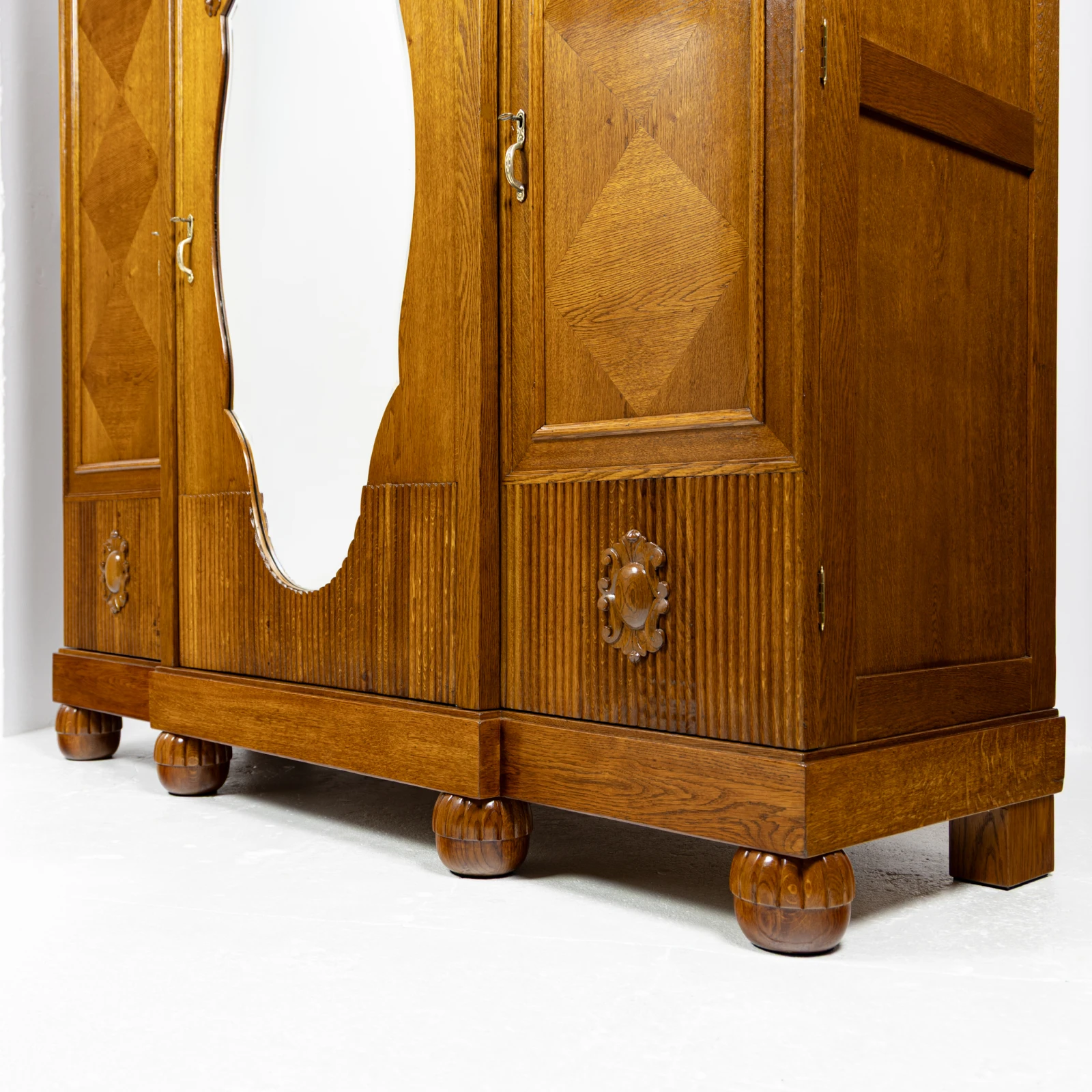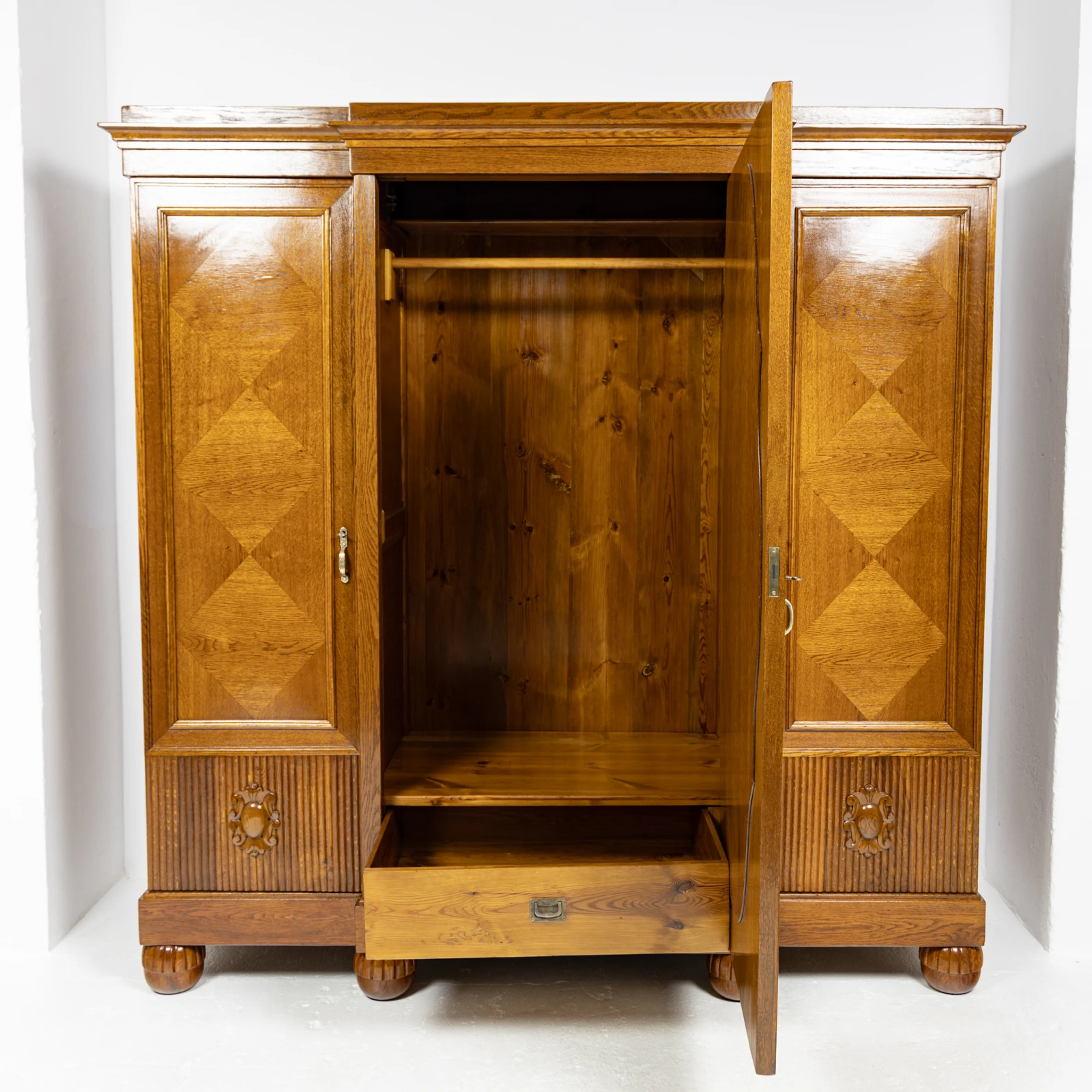Reprezentatywna, trzydrzwiowa szafa dębowa to klasyczny okaz meblarstwa popularnego w Europie w latach 1920–1939. Projekt ten stanowi wyważoną syntezę historyzujących form z rodzącą się nowoczesnością, co pozwala na płynne wkomponowanie mebla zarówno w wystrój klasycznej kamienicy, jak i eklektycznego apartamentu. Szafa pochodzi z Polski (okolice Konina) i jest doskonałym przykładem nurtu tradycjonalizmu mieszczańskiego.