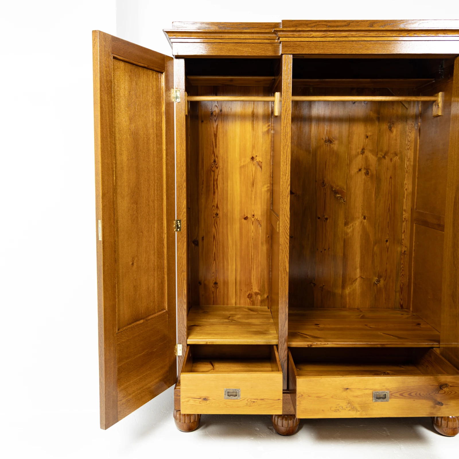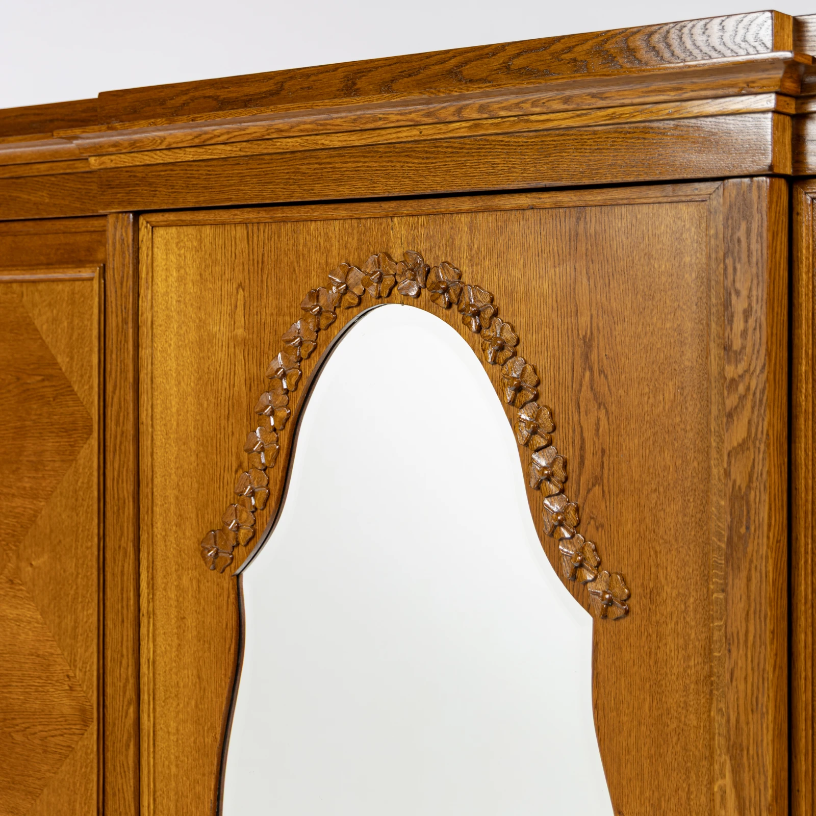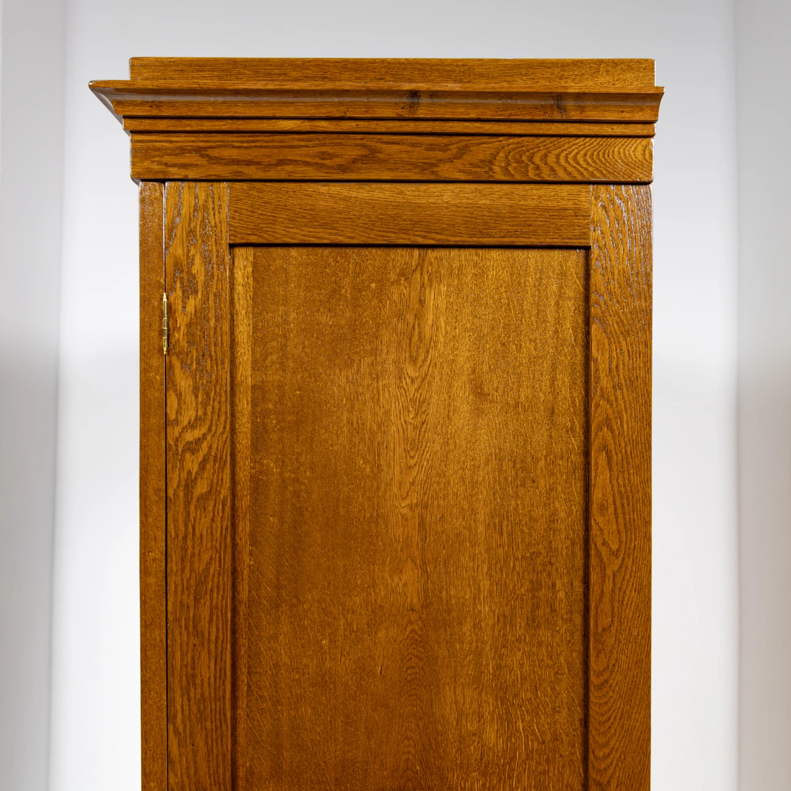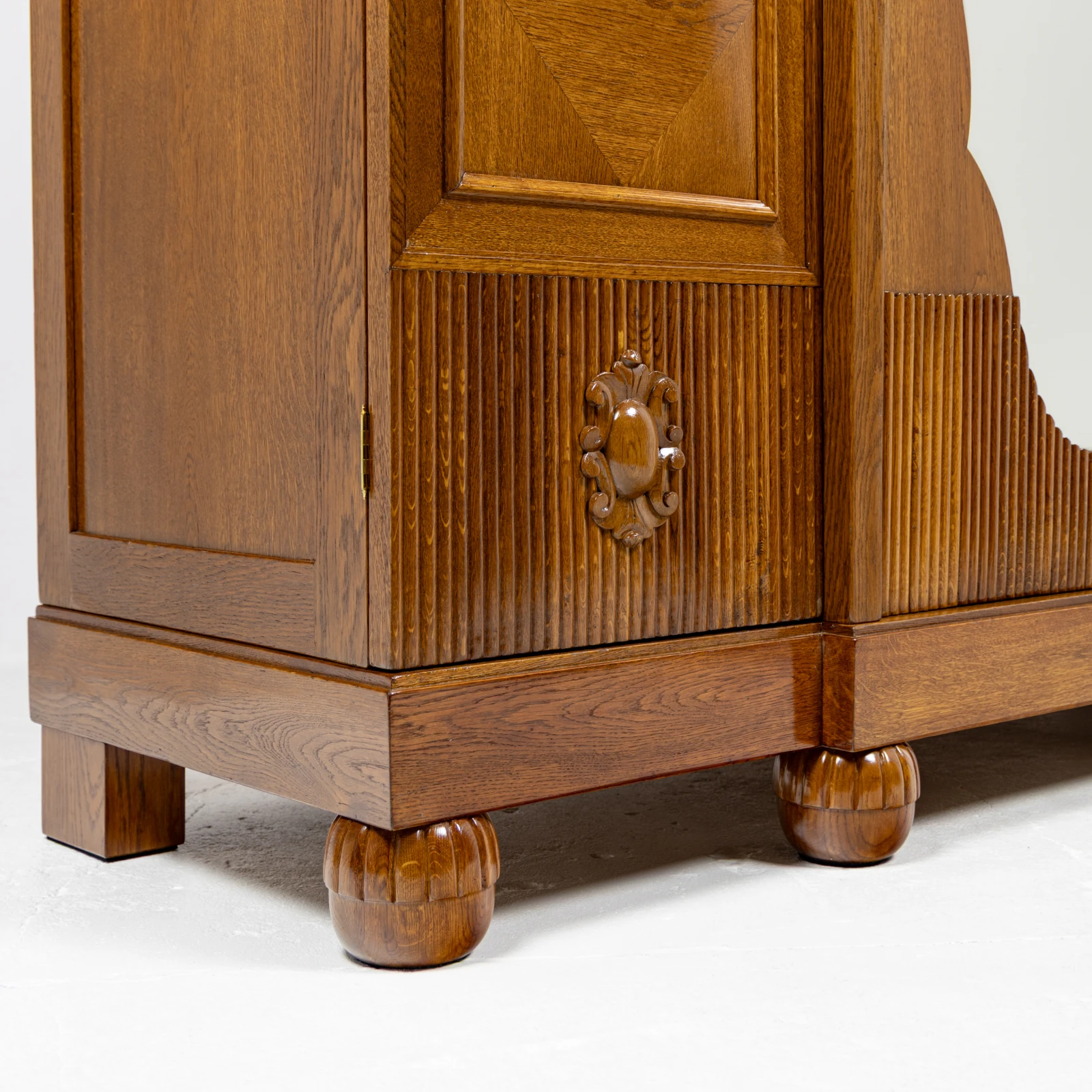 Reprezentatywna, trzydrzwiowa szafa dębowa to klasyczny okaz meblarstwa popularnego w Europie w latach 1920–1939. Projekt ten stanowi wyważoną syntezę historyzujących form z rodzącą się nowoczesnością, co pozwala na płynne wkomponowanie mebla zarówno w wystrój klasycznej kamienicy, jak i eklektycznego apartamentu. Szafa pochodzi z Polski (okolice Konina) i jest doskonałym przykładem nurtu tradycjonalizmu mieszczańskiego.