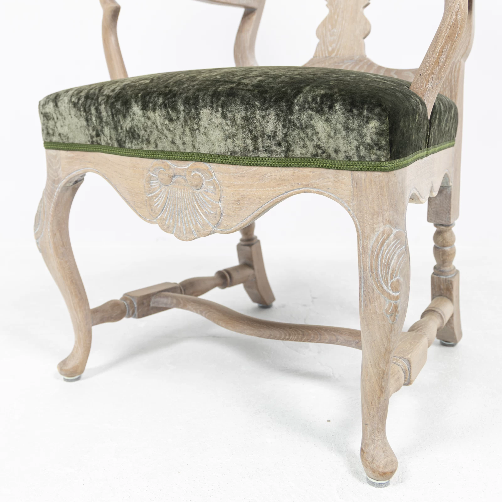 Fotel został wykonany z wytrzymałego masywu drewna dębowego, co gwarantuje jego trwałość na długie lata. Cała tapicerka jest nowa, wykonana z niezwykłą precyzją i ściśle według starych technologii. Zastosowano tradycyjne wiązane sprężyny, ręcznie szyty fason z juty oraz naturalne wypełnienie z trawy morskiej, co zapewnia niezrównany komfort siedzenia i długowieczność. Materiał obiciowy to gruby, zielony plusz, charakteryzujący się mocnym opalizowaniem, który dodaje fotelowi luksusowego i wyrafinowanego wyglądu.